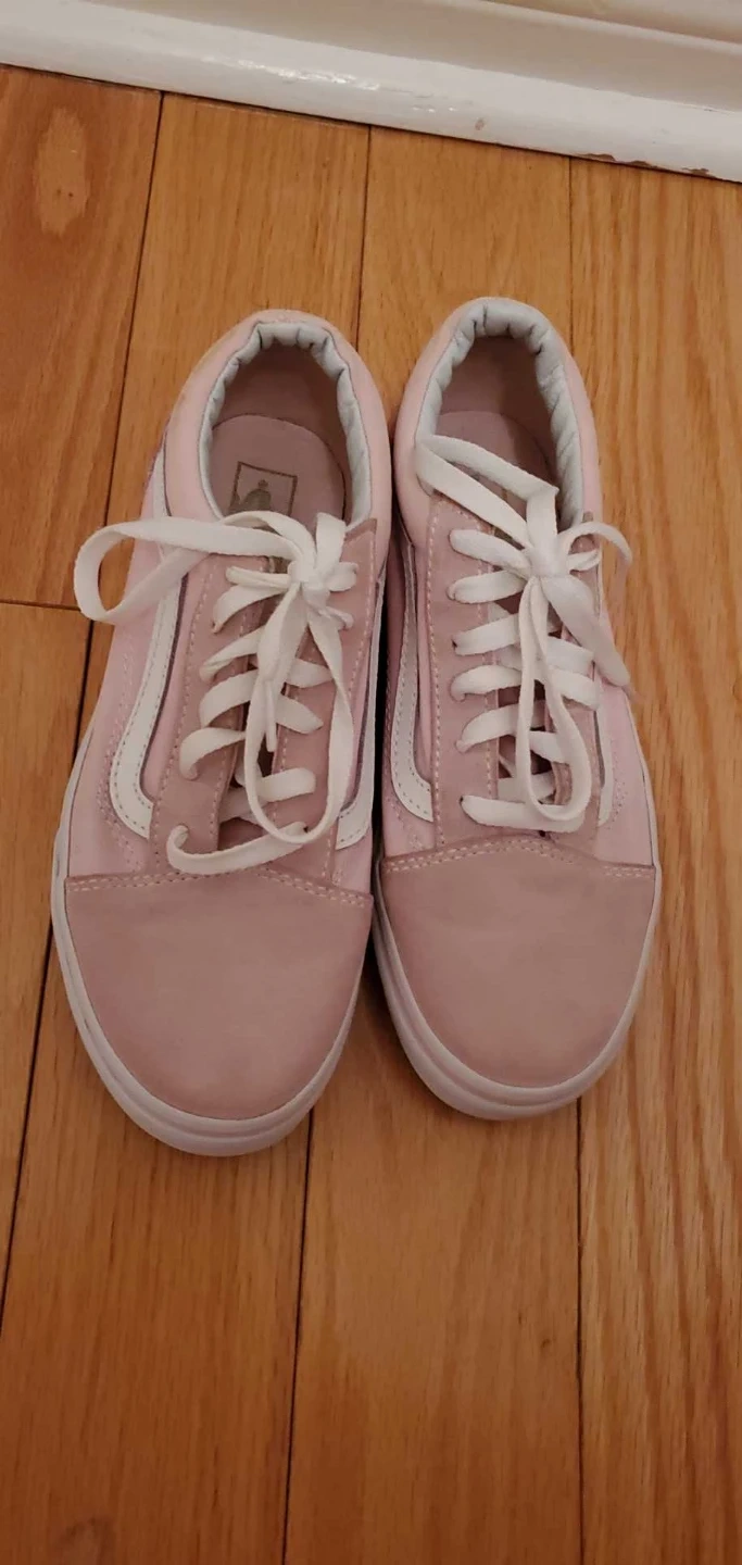 These are pink Vans Old Skool sneakers with white laces. They feature the classic side stripe. These shoes are made for casual wear.