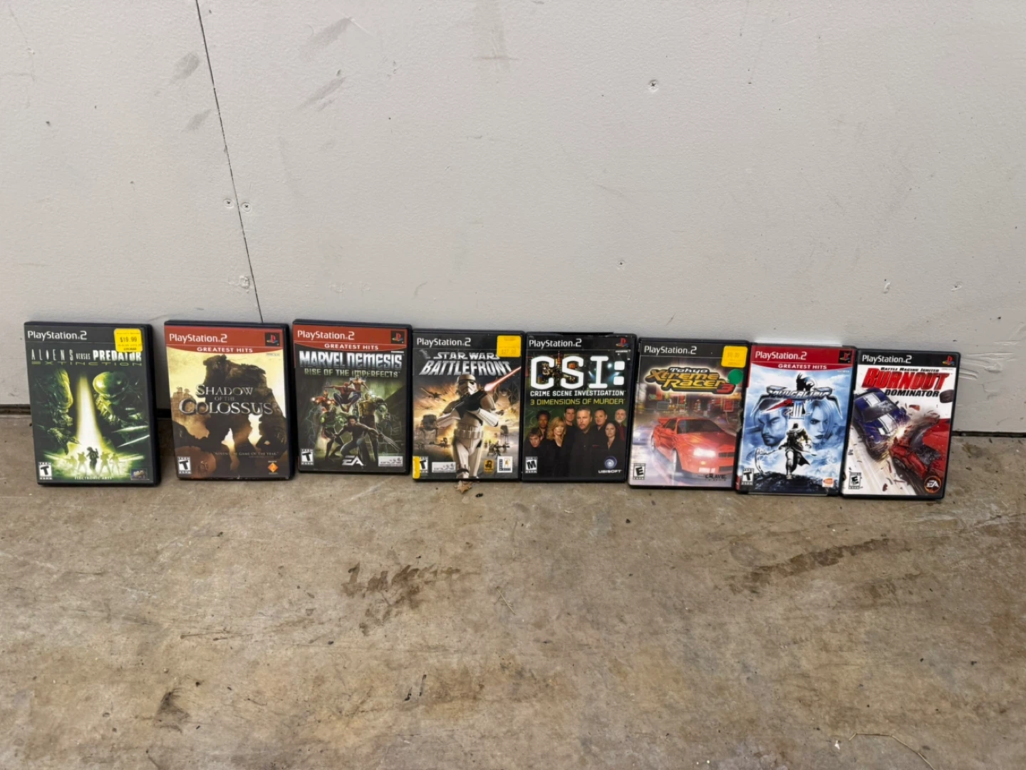 This is a lot of 7 PlayStation 2 games. It includes Aliens vs Predator: Extinction, Shadow of the Colossus, Marvel Nemesis: Rise of the Imperfects, Star Wars Battlefront II, CSI: 3 Dimensions of Murder, Tokyo Xtreme Racer: Zero, and Burnout Dominator. These are all for the PlayStation 2 console.
