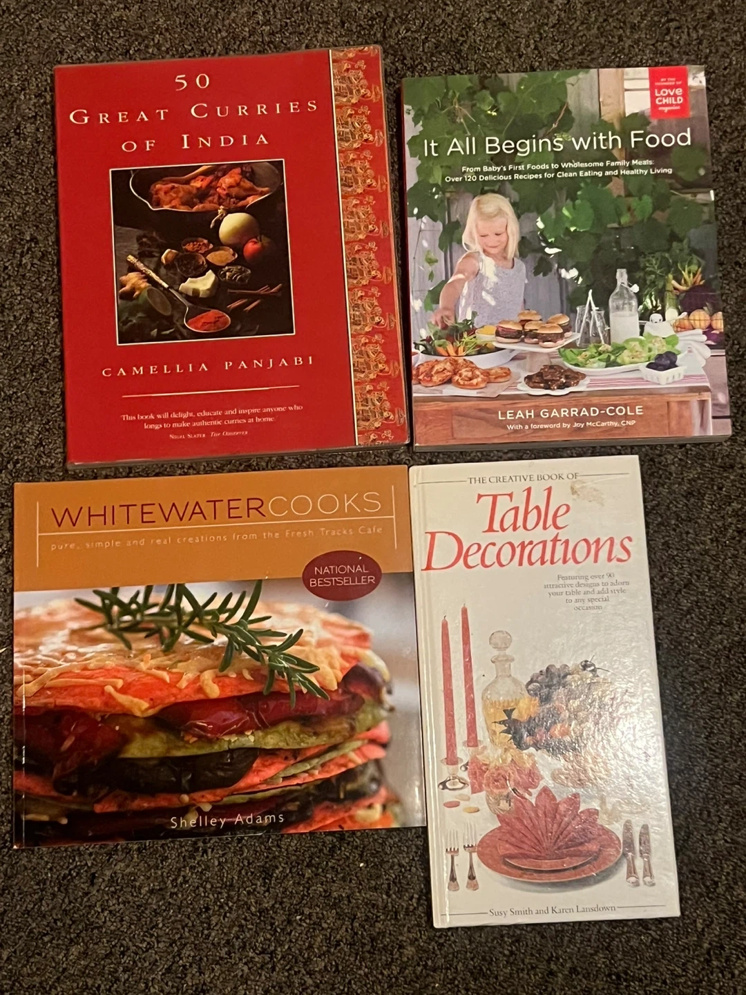 This lot includes four cookbooks: '50 Great Curries of India' by Camellia Panjabi, 'It All Begins with Food' by Leah Garrad-Cole, 'Whitewater Cooks' by Shelley Adams, and 'The Creative Book of Table Decorations' by Susy Smith and Karen Lansdown. These books offer a variety of recipes and decorating ideas. Price $15-$20 each