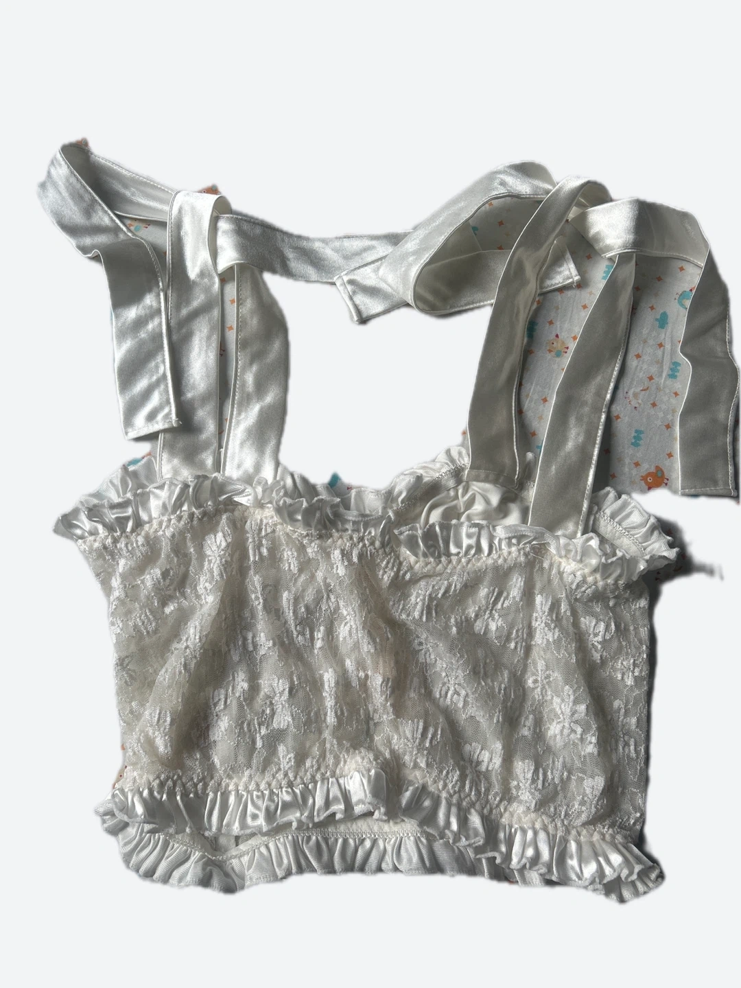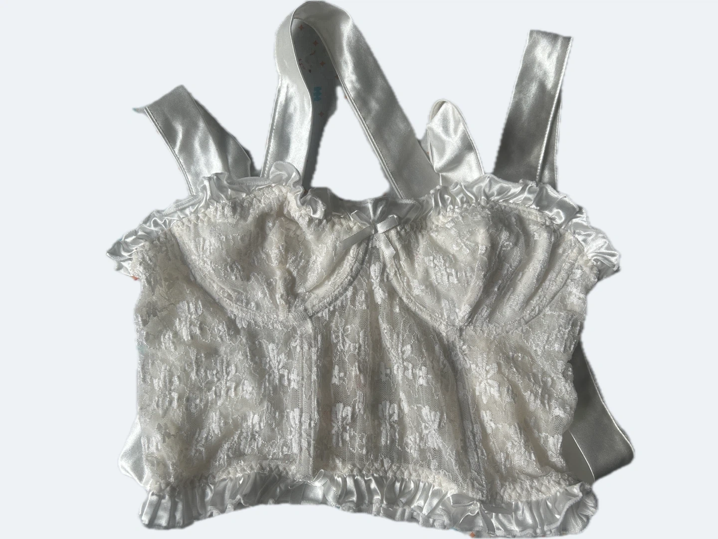This is a lovely white lace corset top with satin trim and adjustable tie straps. It features a delicate floral lace overlay and ruffled hem. It's a stylish piece for layering or wearing on its own. Size small
