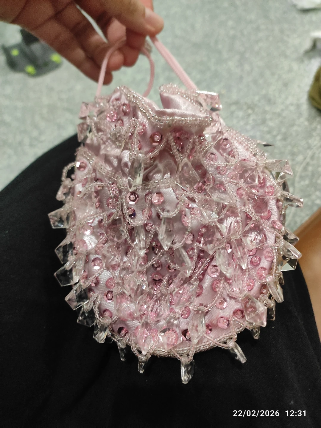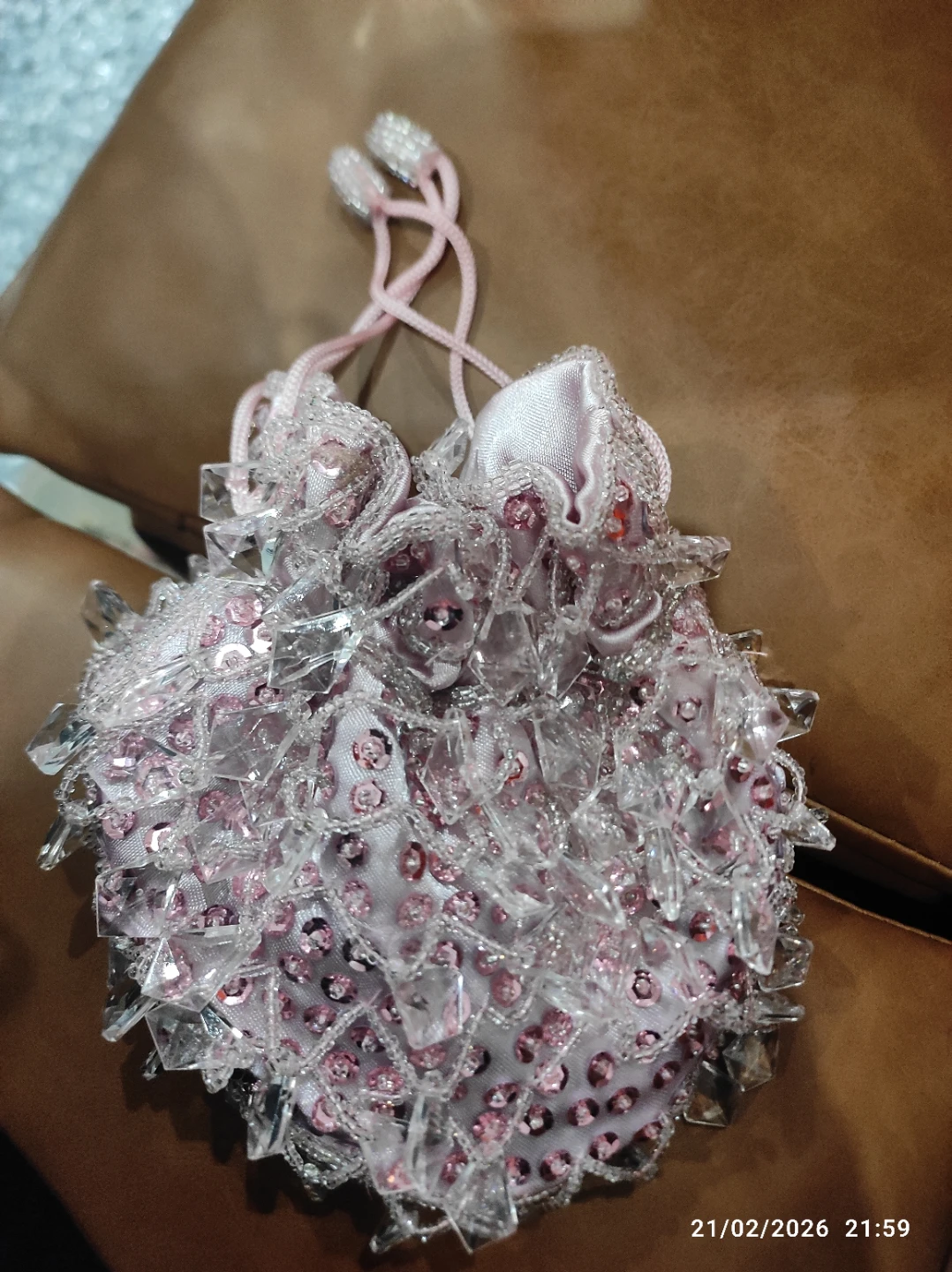 This pretty pink pouch bag is covered in sequins and beads with clear crystal accents. It has a satin lining and a drawstring closure with decorative tassels. It's a lovely accessory for special occasions!