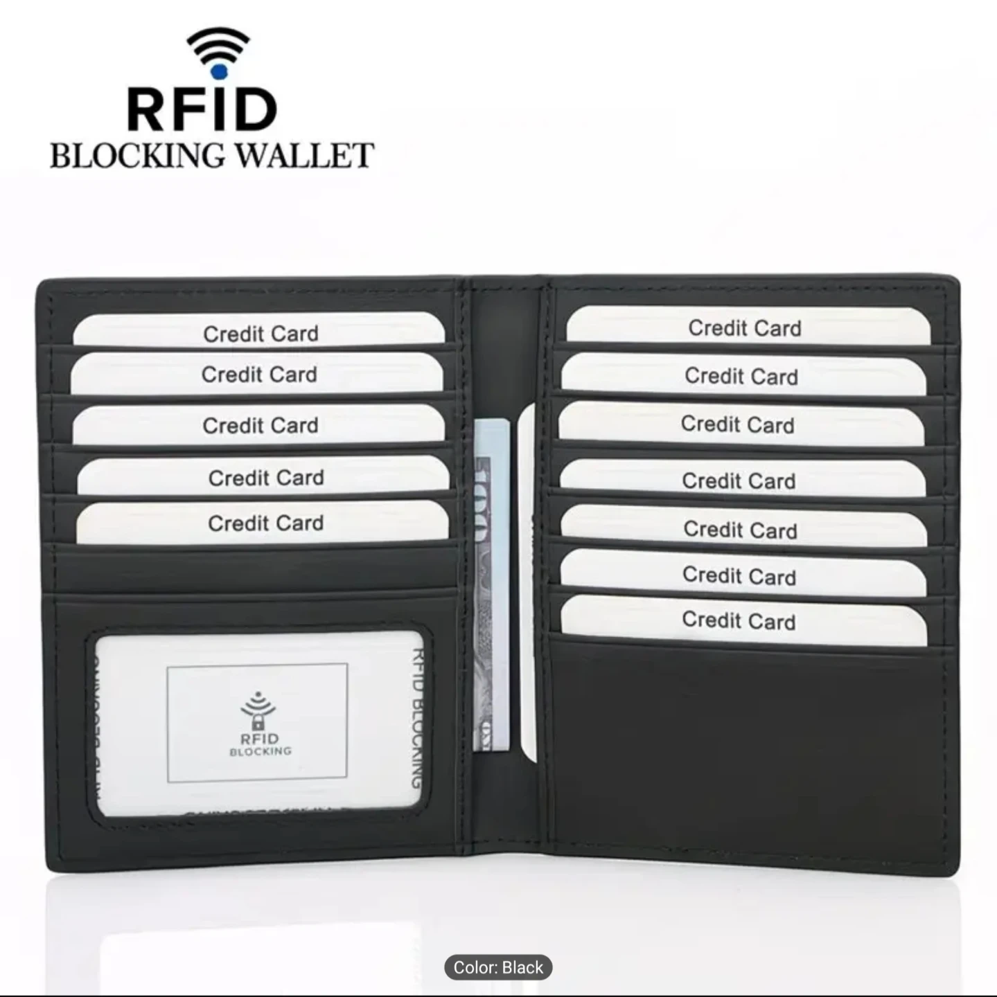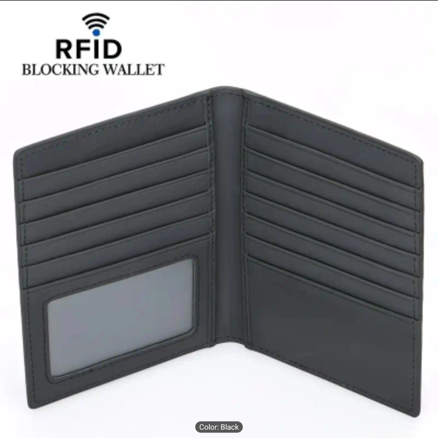 This black RFID blocking wallet holds multiple cards. It's made from a durable material and features a clear ID window. It measures 13.5cm by 10.5cm.