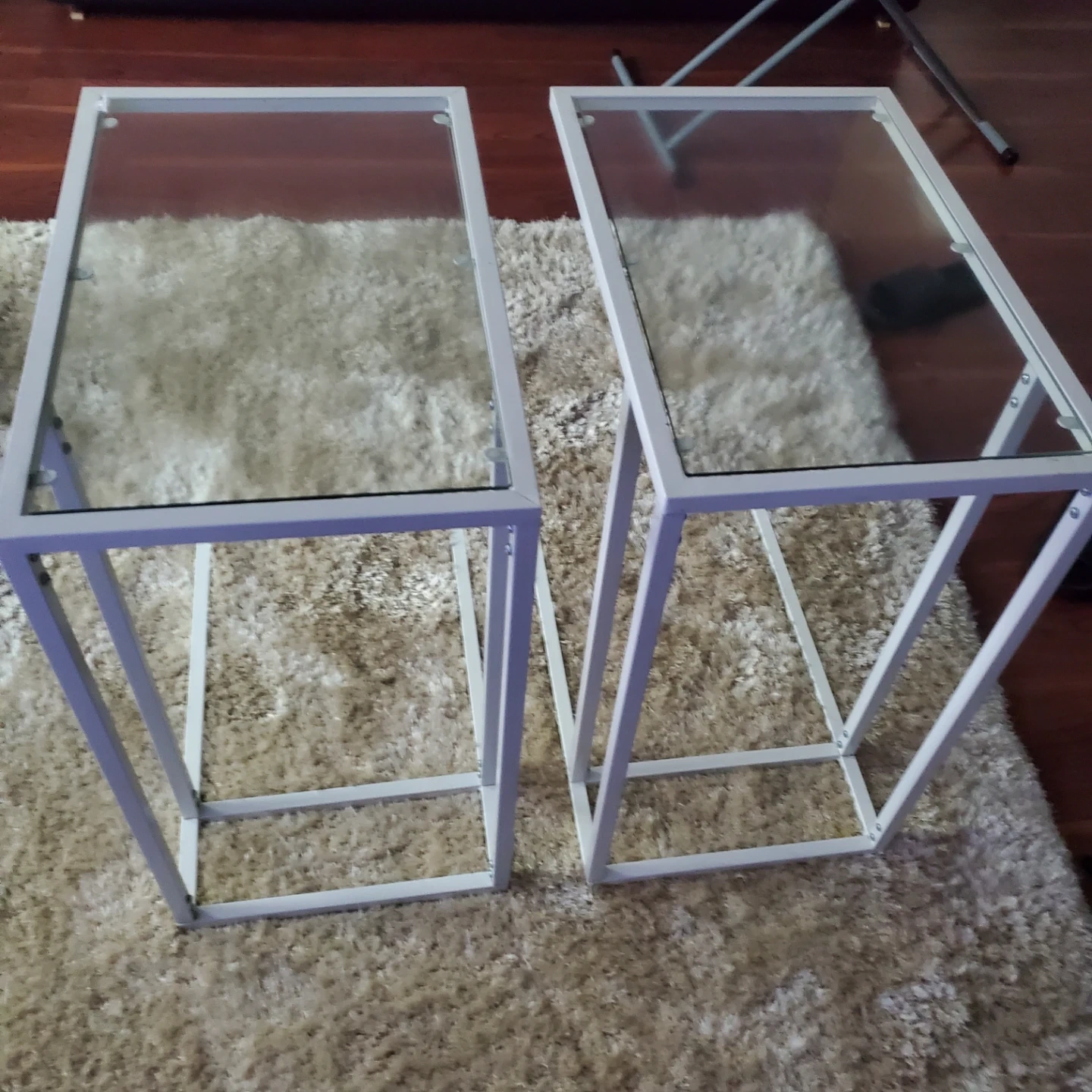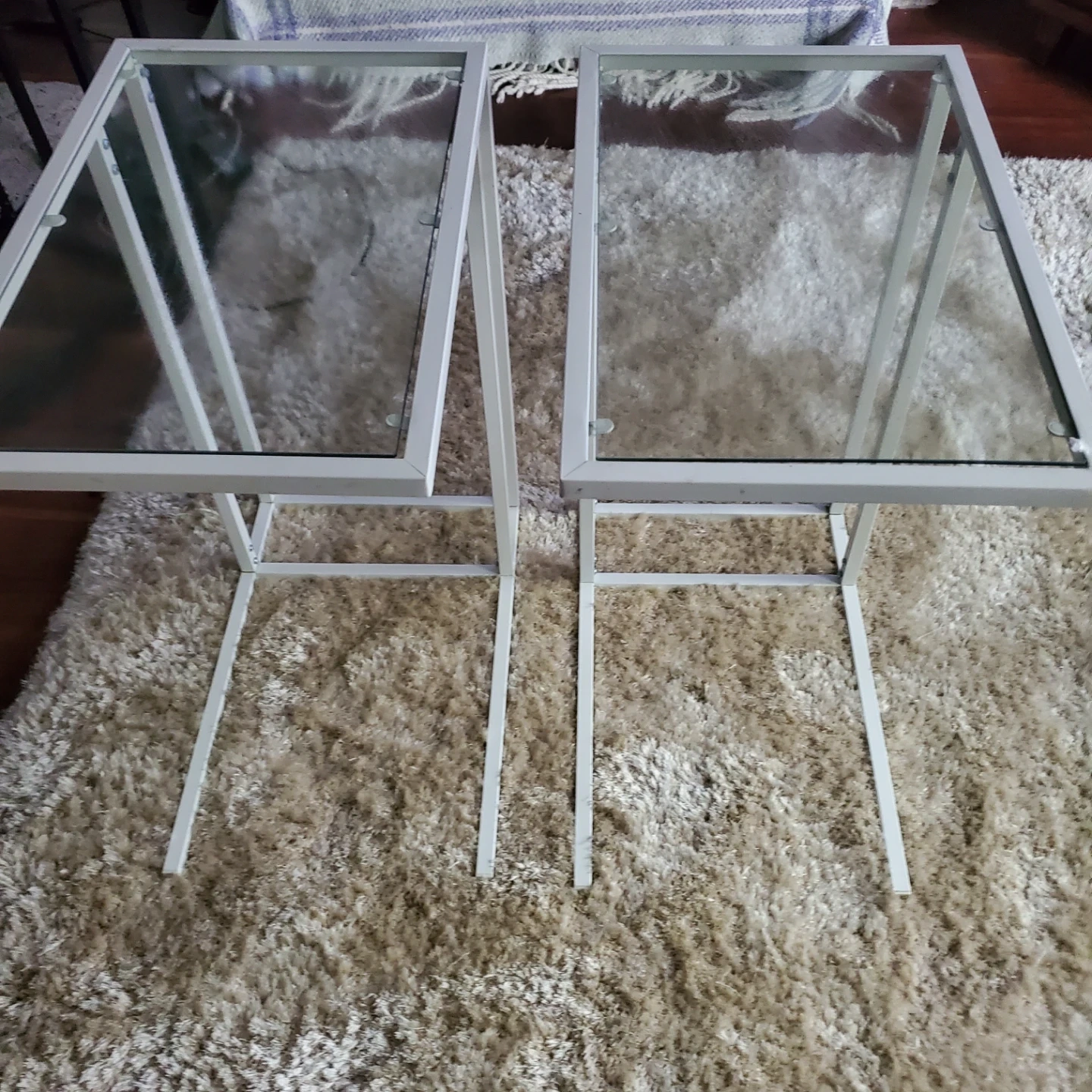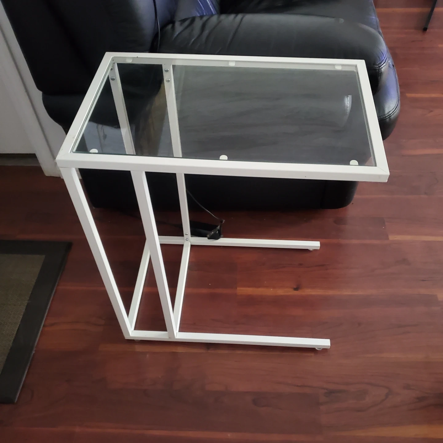 White metal C-table with a clear glass top. This table is a handy side table that slides under couches or chairs. Metal frame and glass surface.
