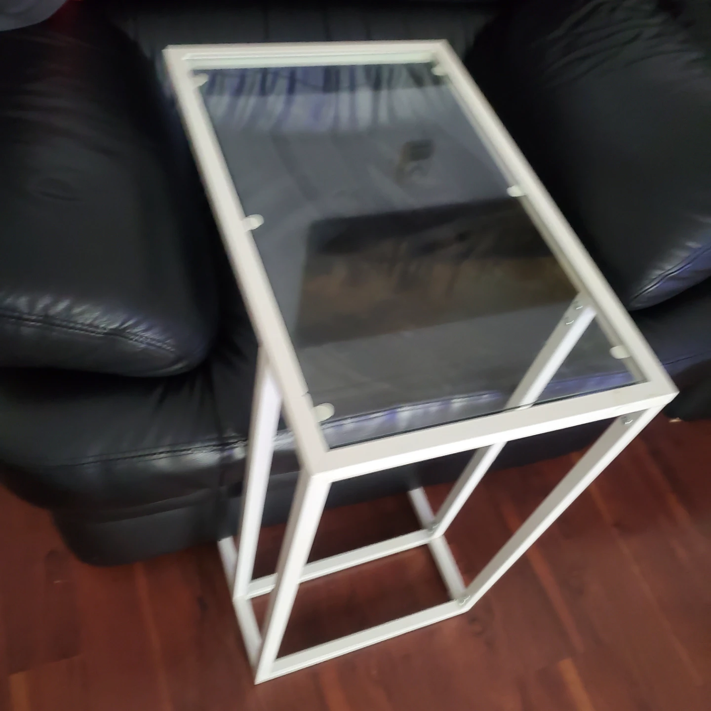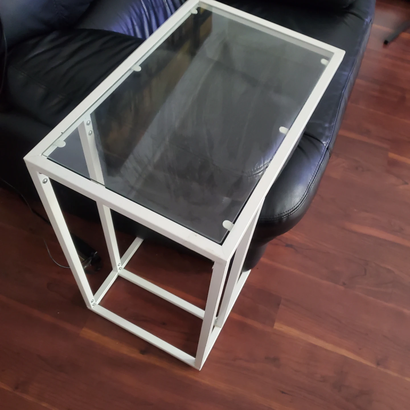 White metal C-table with a clear glass top. This table is a handy side table that slides under couches or chairs. Metal frame and glass surface.