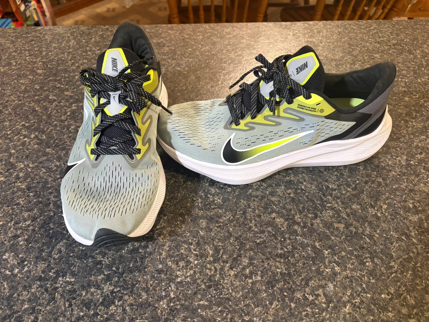 These Nike Zoom running shoes are designed for performance. They feature a lightweight, breathable mesh upper and a responsive cushioning system. The shoes are grey with neon yellow accents and black laces.