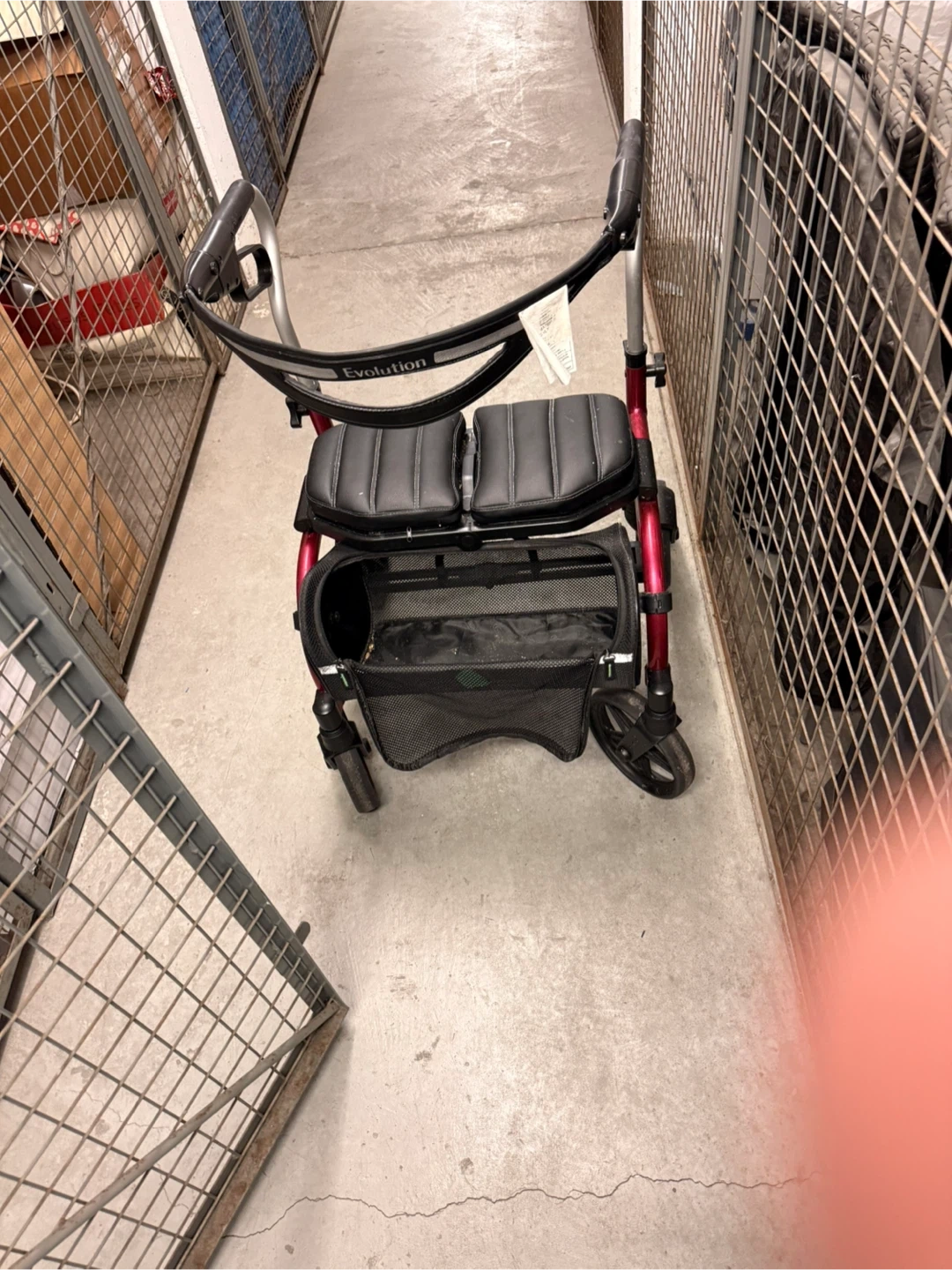 This is an Evolution brand rollator walker. It features a padded seat and a removable basket for storage. The frame is made of lightweight metal and has adjustable hand grips. It's designed to provide stability and support for walking.