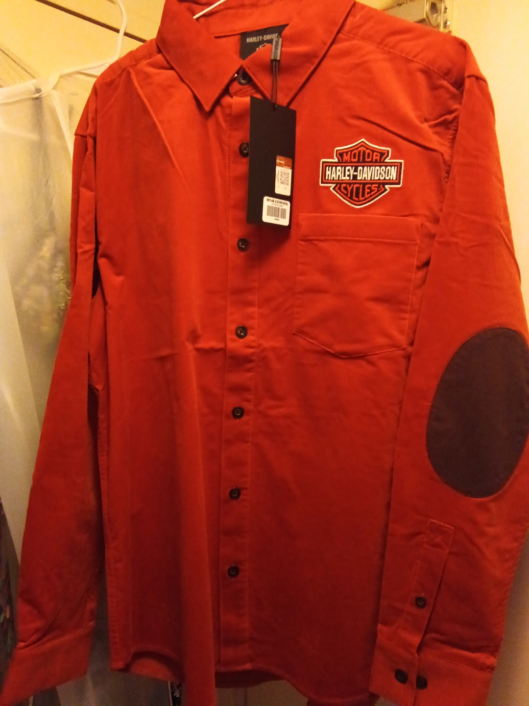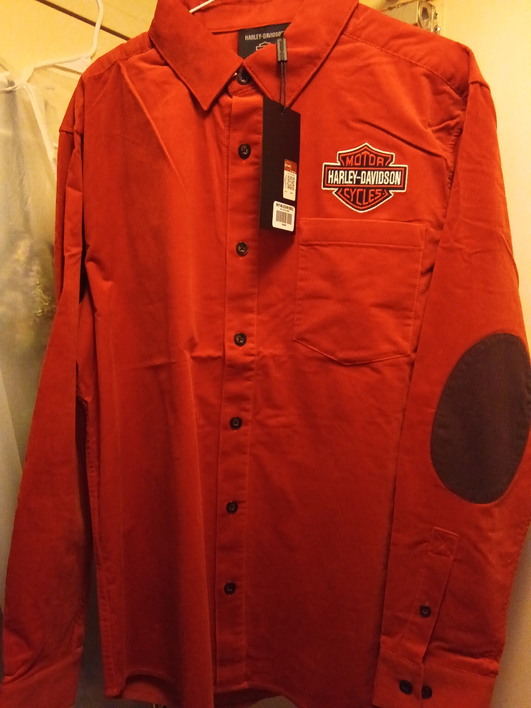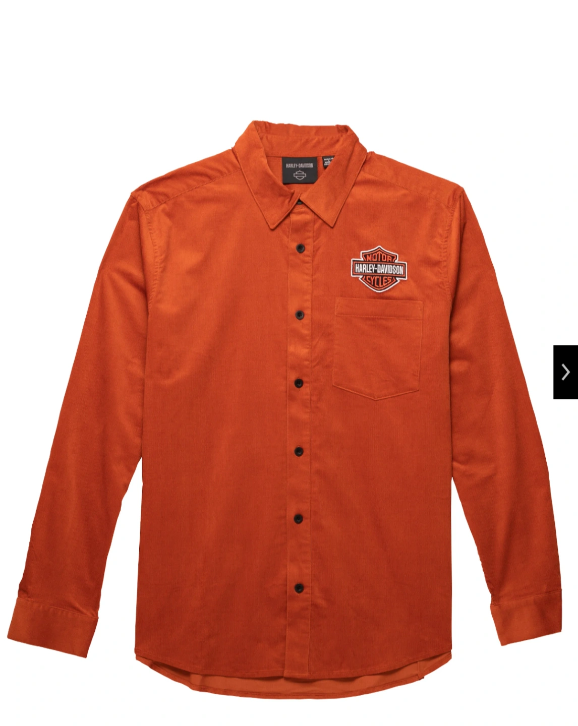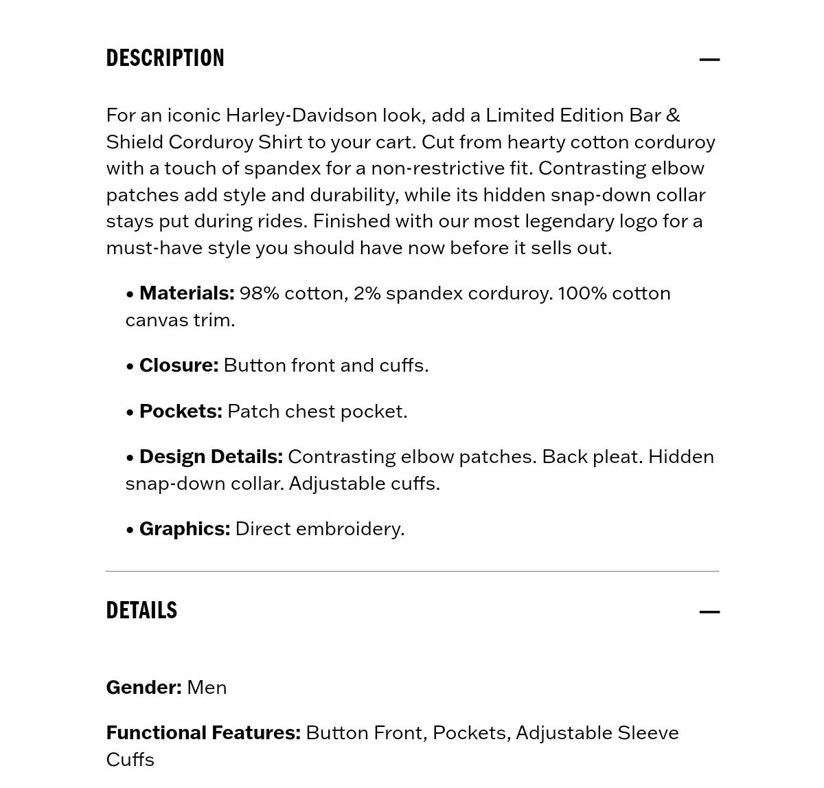 Authentic Harley-Davidson Limited Edition Bar & Shield Corduroy Shirt. Hearty cotton corduroy with a touch of spandex. Non-restrictive fit. Contrasting elbow patches. Hidden snap-down collar. Button front and cuffs. Patch chest pocket. Back pleat. Direct embroidery.