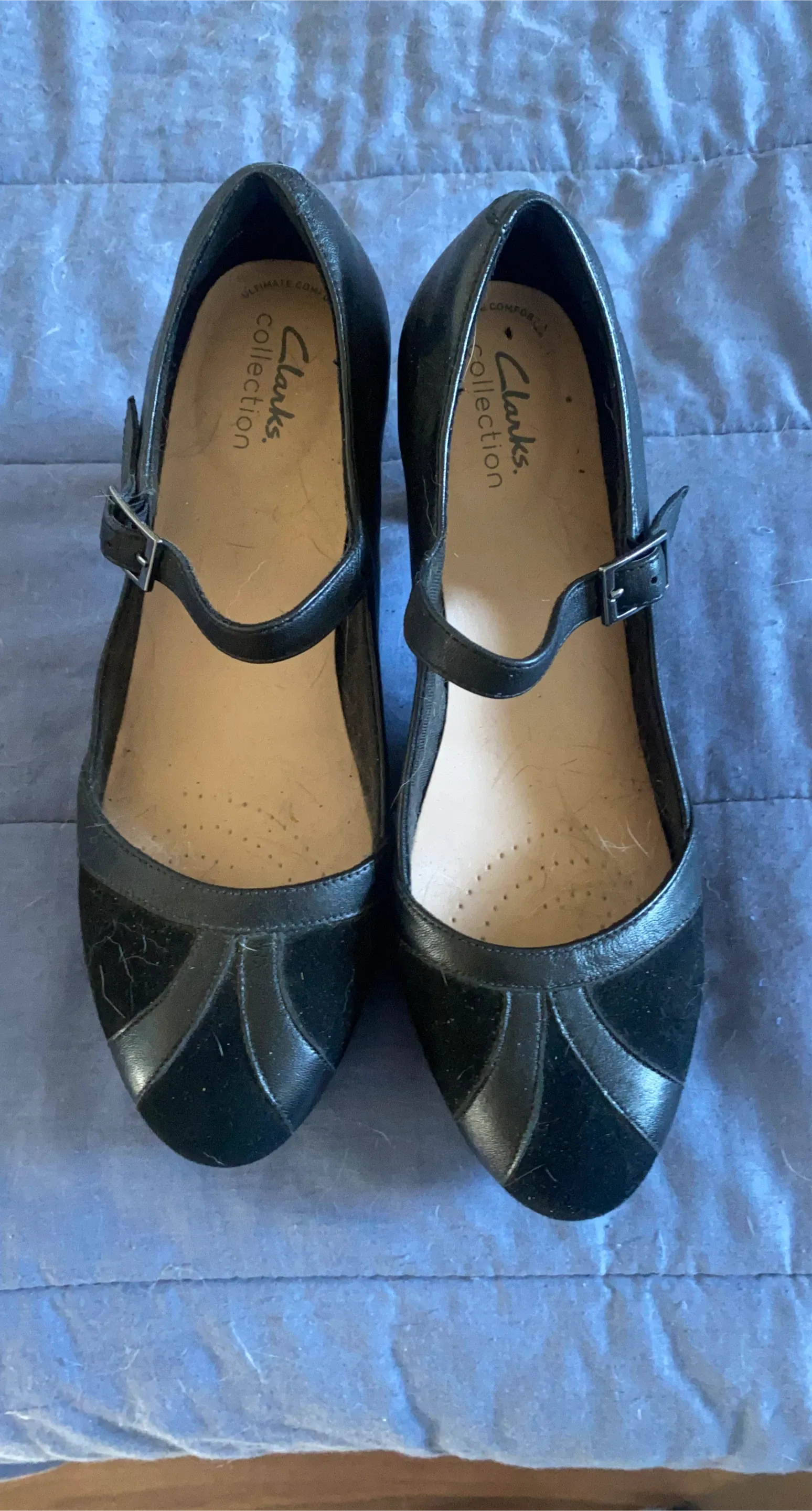 These Clarks Collection Mary Jane heels are a classic black. They feature a buckle strap and a combination of leather and suede materials. This footwear is suitable for various occasions.