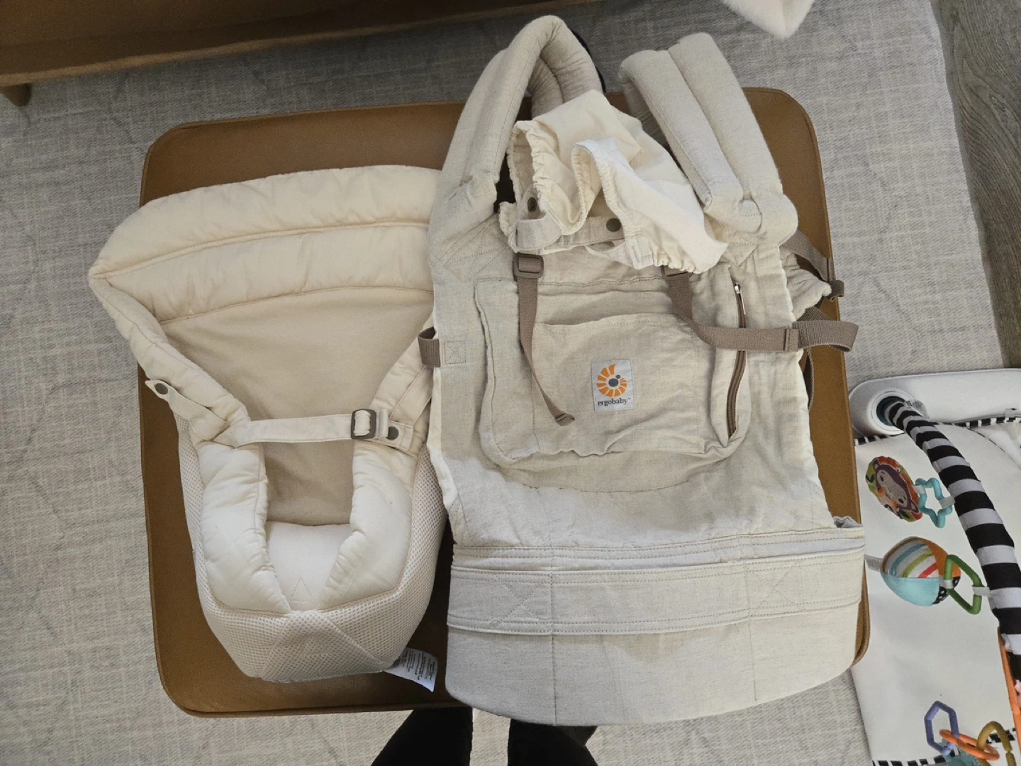 Lightly used Ergobaby Original baby carrier. Natural linen colour. Includes infant insert. Comfortable and supportive design. Suitable for newborns to toddlers.