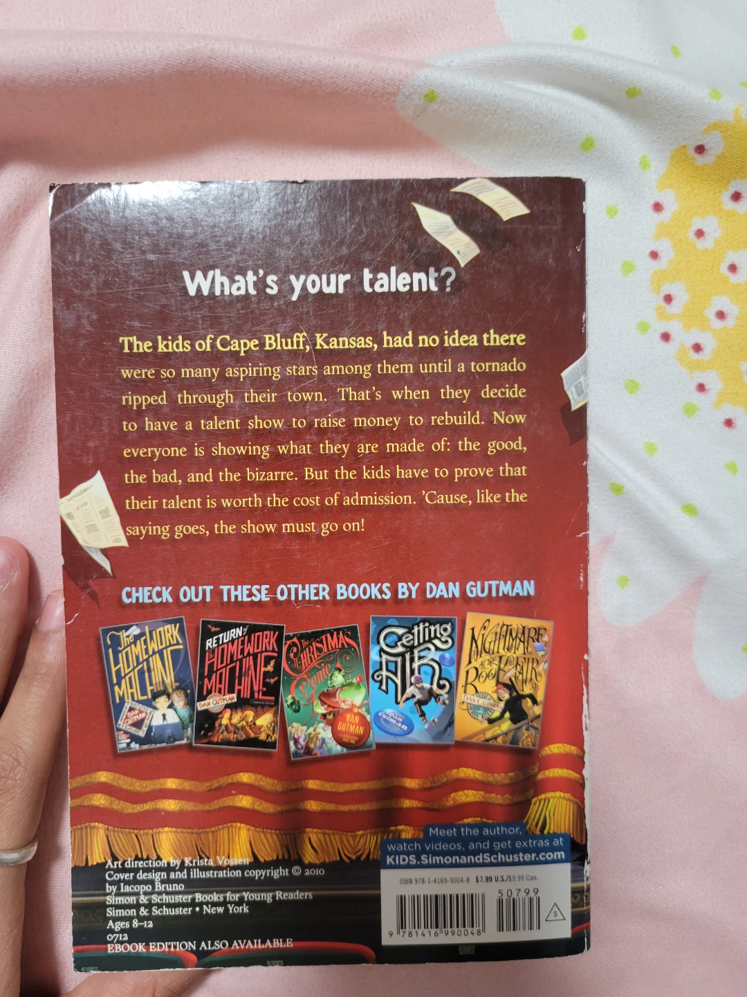 This paperback book is titled 'The Talent Show' by Dan Gutman. It's part of a series for young readers. The recommended age is 8-12.