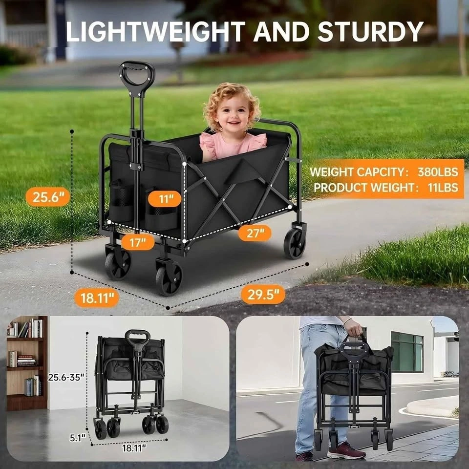 Sturdy folding wagon for all your hauling needs. This heavy-duty cart has a 380lbs weight capacity and only weighs 11lbs itself. It has all-terrain wheels that rotate 360 degrees, so it's super easy to maneuver on gravel, mud, grass, or pavement. Folds up super compact to just 5.1 inches thick, making it easy to store in your car or garage. Has an adjustable handle and handy bottle holders too. Great for camping, groceries, beach trips, or gardening.