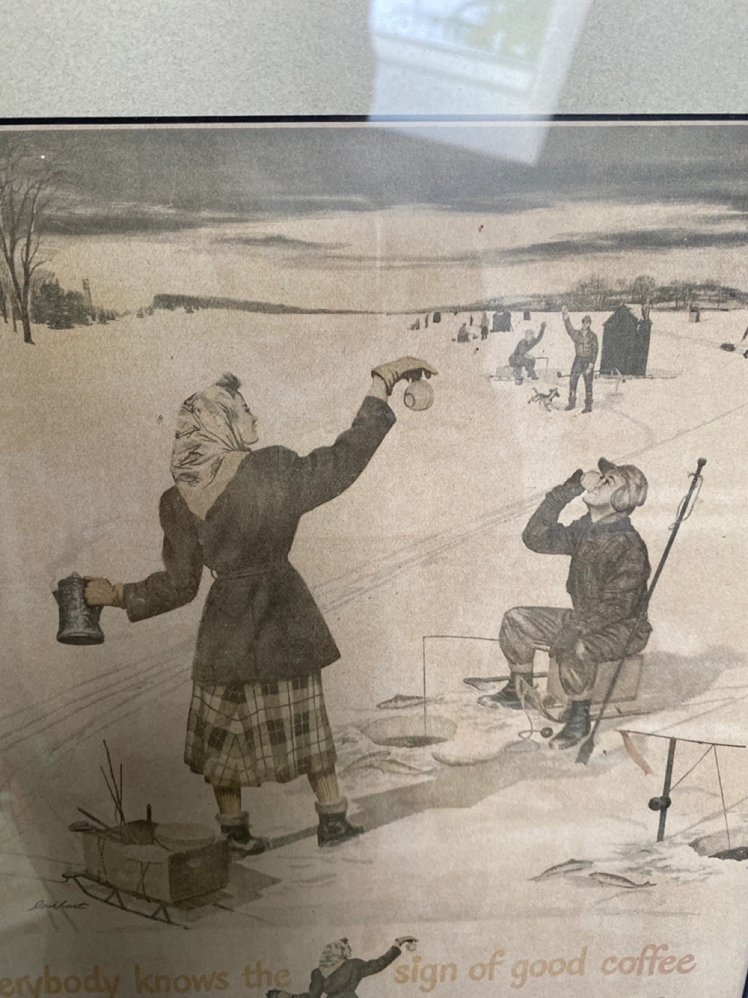 I'm selling a vintage Maxwell House coffee print in a frame. The print depicts a winter scene with people ice fishing and enjoying coffee. It's a charming piece that would add a touch of nostalgia to any room