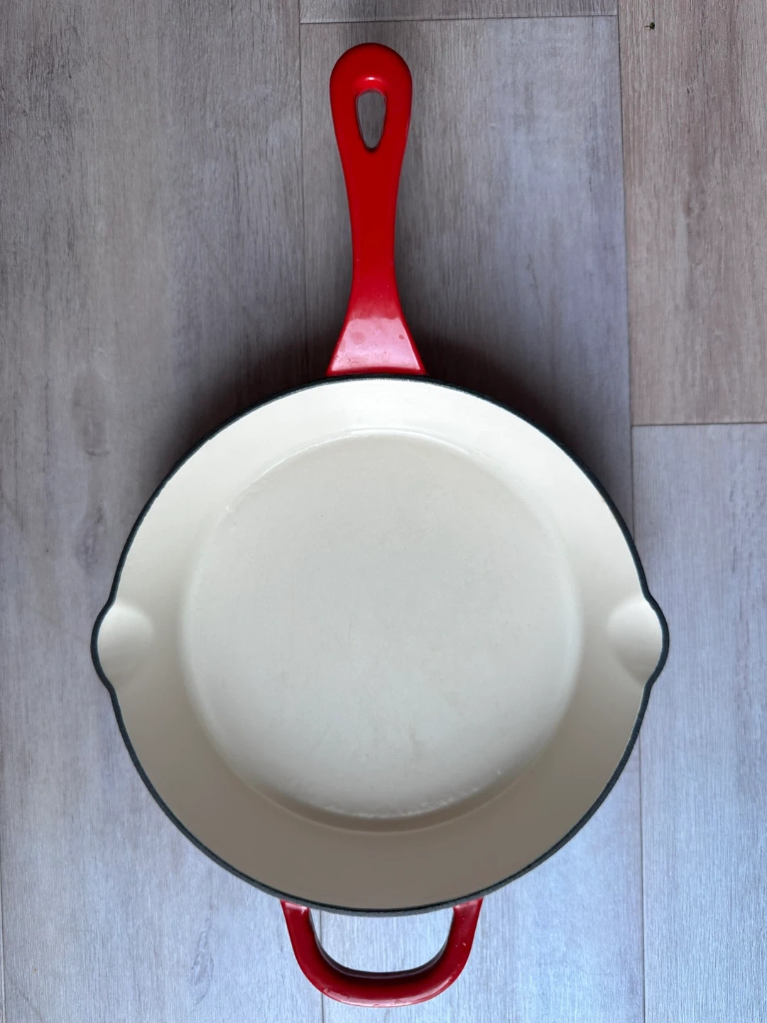 This Crock-Pot skillet is made of durable cast iron. It's finished in a vibrant red colour. This pan's a great addition for any home chef!