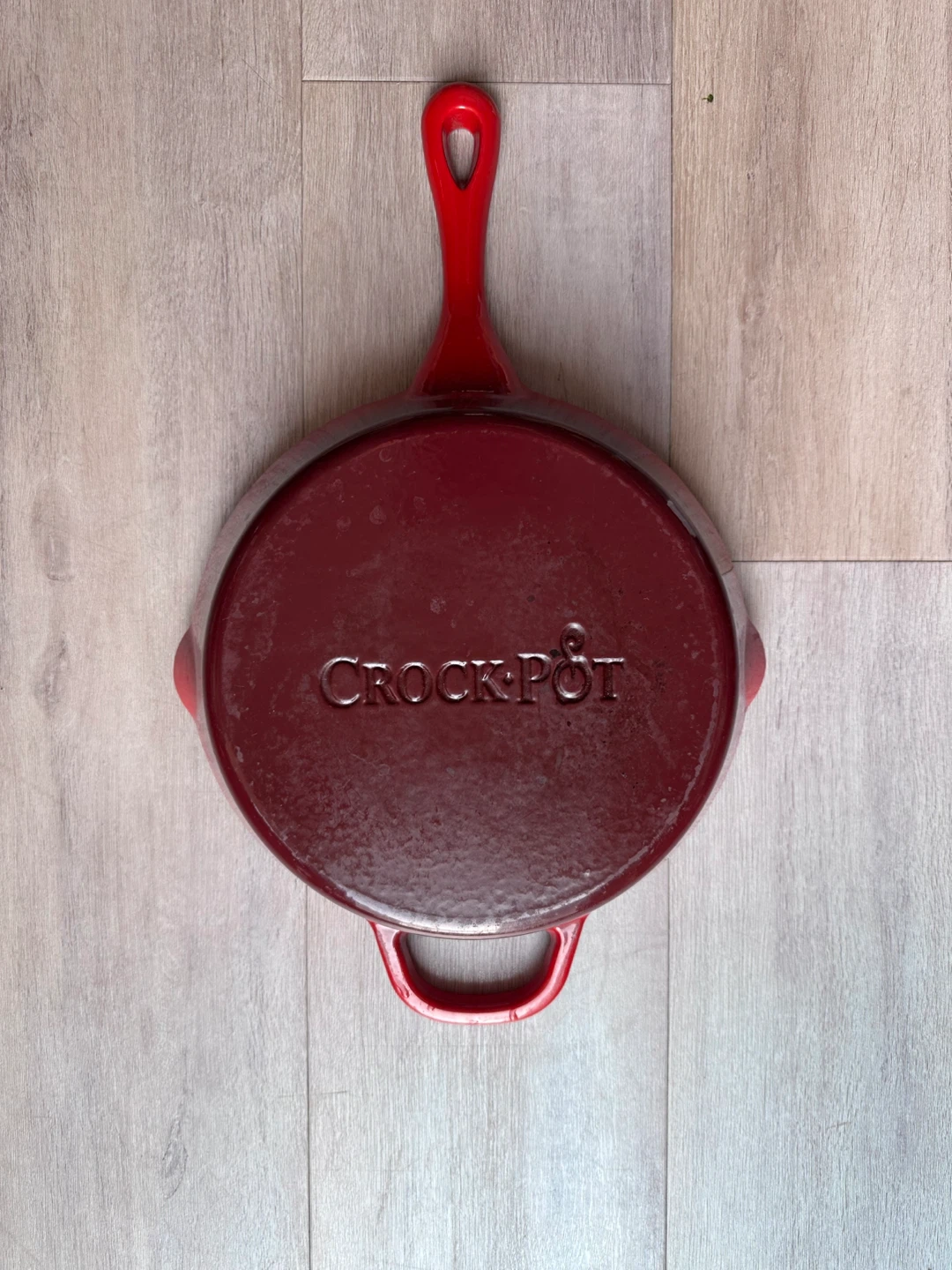 This Crock-Pot skillet is made of durable cast iron. It's finished in a vibrant red colour. This pan's a great addition for any home chef!