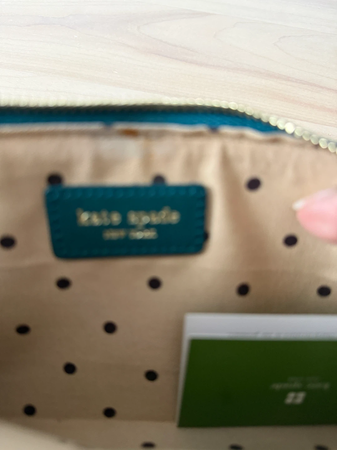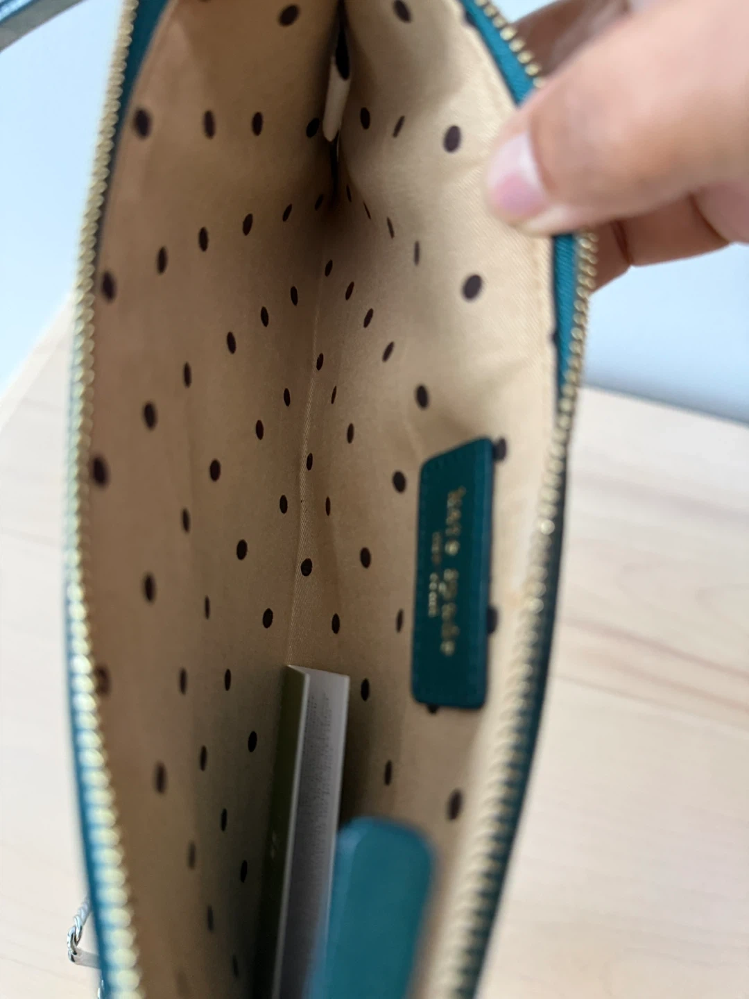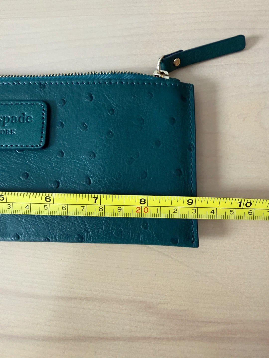 A Kate Spade wristlet with an ostrich-embossed design in a deep teal colour. It measures approximately 10 inches in length. This clutch is perfect for carrying your essentials when you're on the go!
