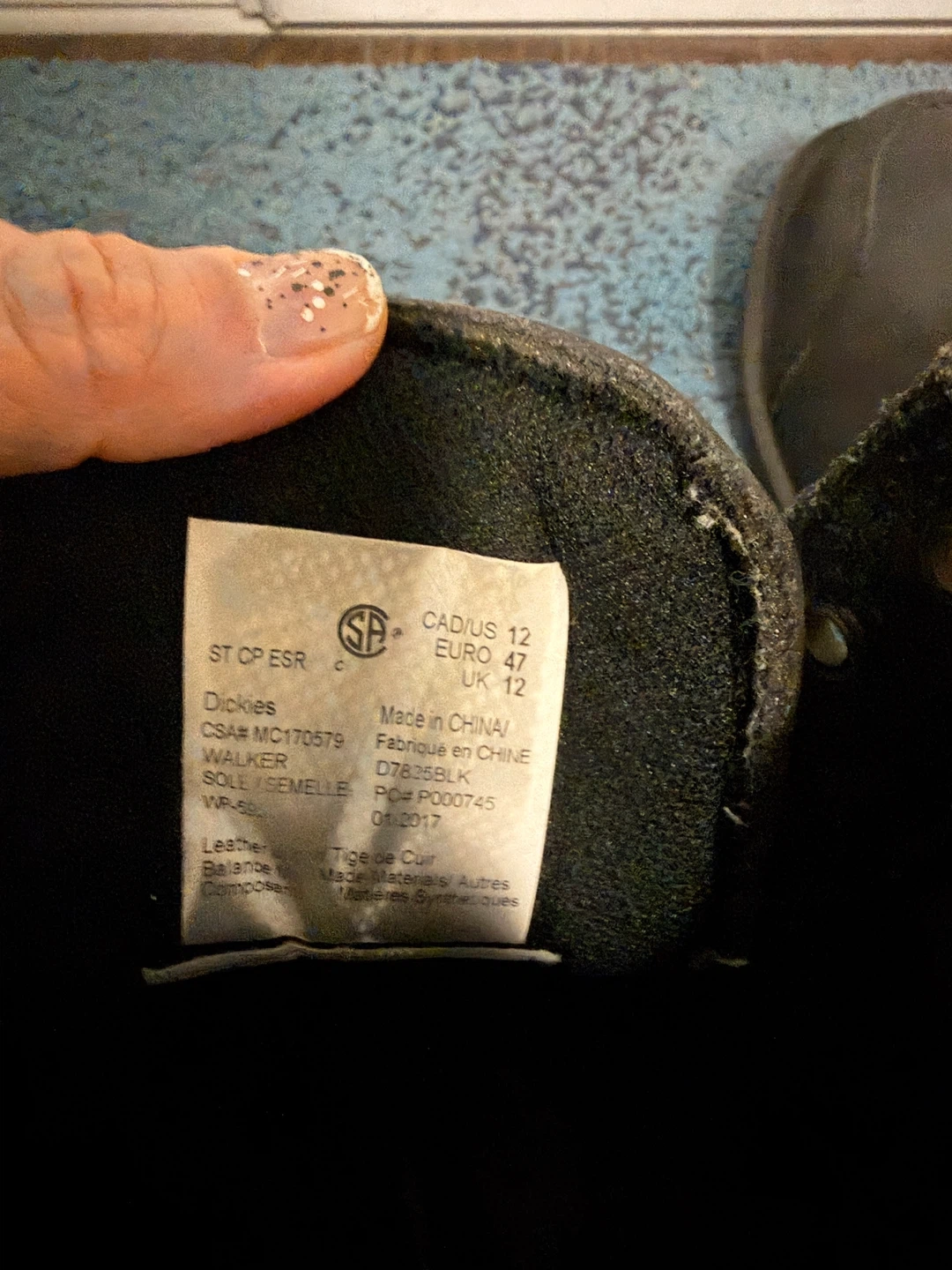 Dickies steel toe work boots in black. CAD/US size 12, Euro 47, UK 12. Made in China. Leather upper, composite sole.