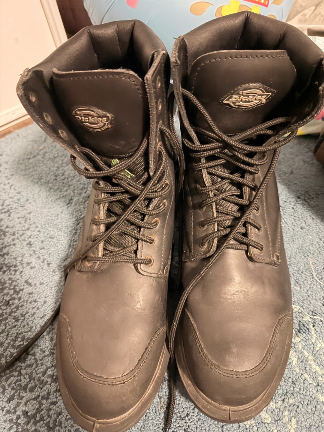 Dickies steel toe work boots in black. CAD/US size 12, Euro 47, UK 12. Made in China. Leather upper, composite sole.
