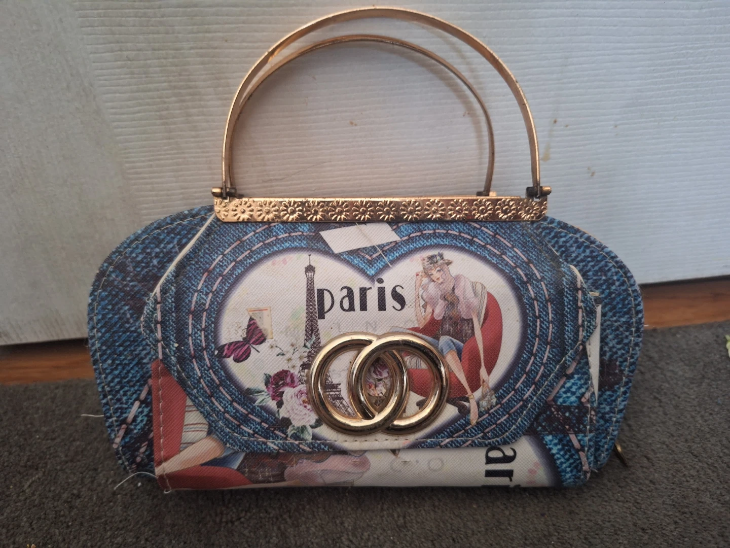This cute mini handbag features a 'Paris' design with a denim-style trim and gold-tone hardware. It's perfect for adding a touch of Parisian flair to your outfit!