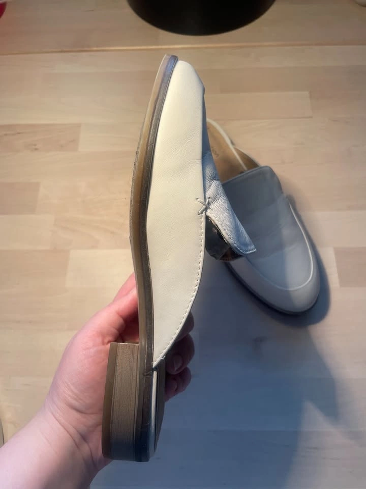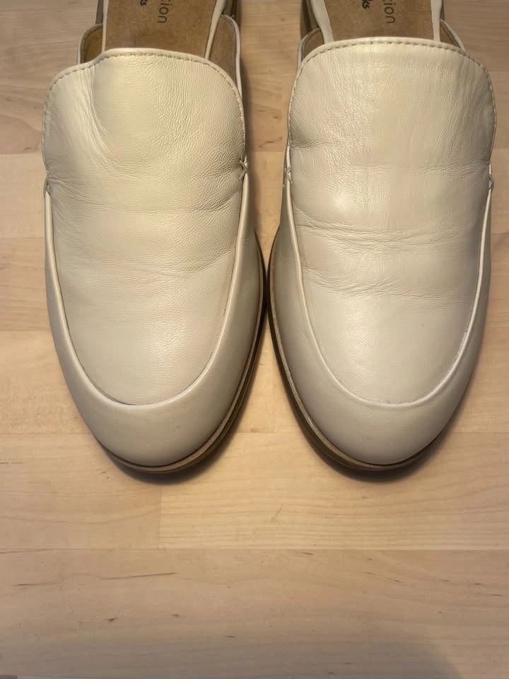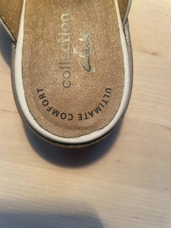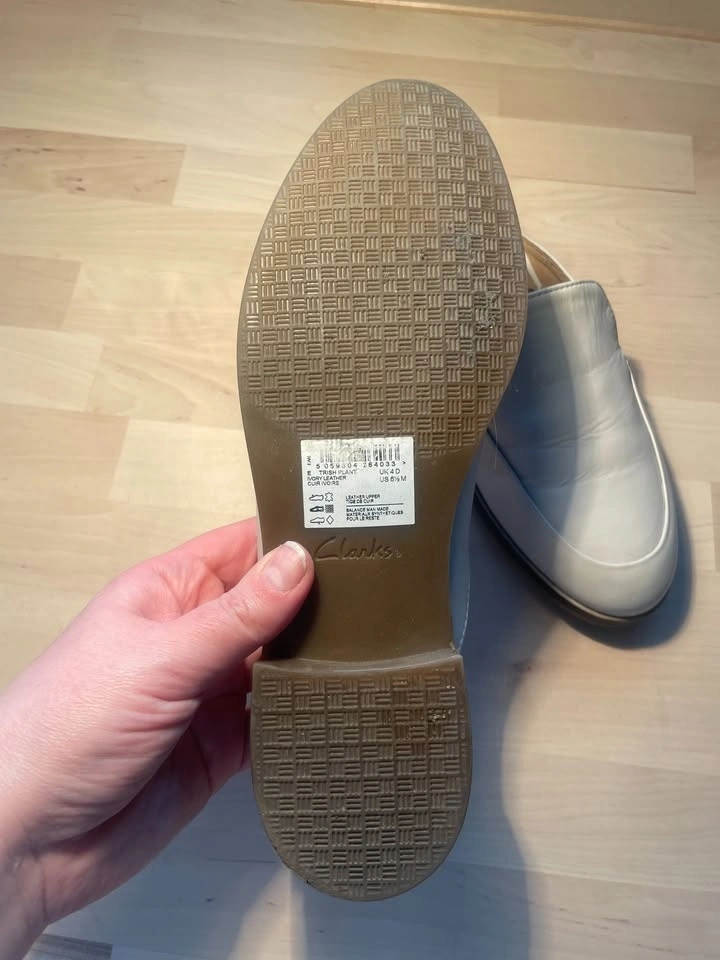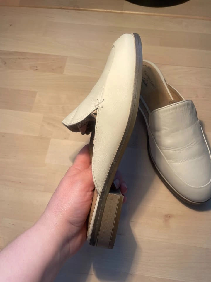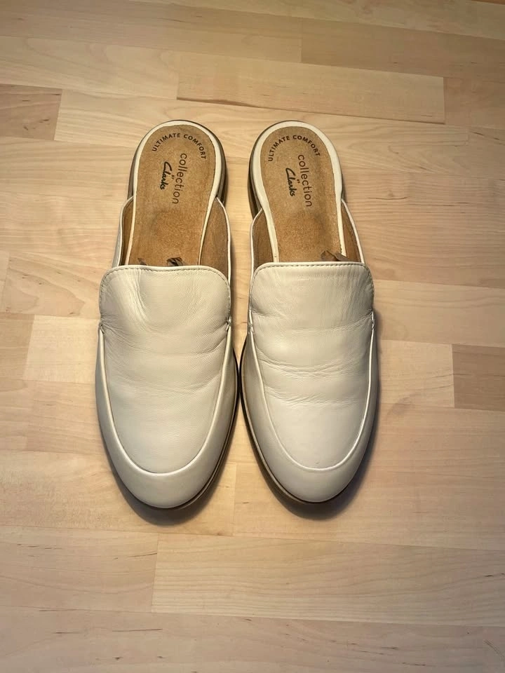 US 6.5, Clarks Trish Plant mules in ivory leather.
