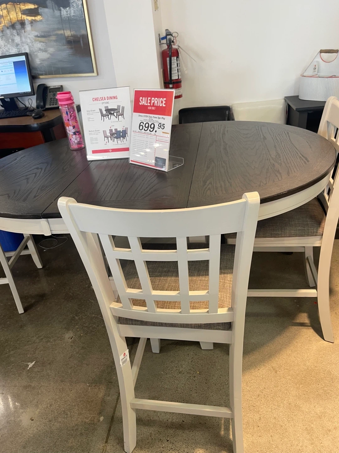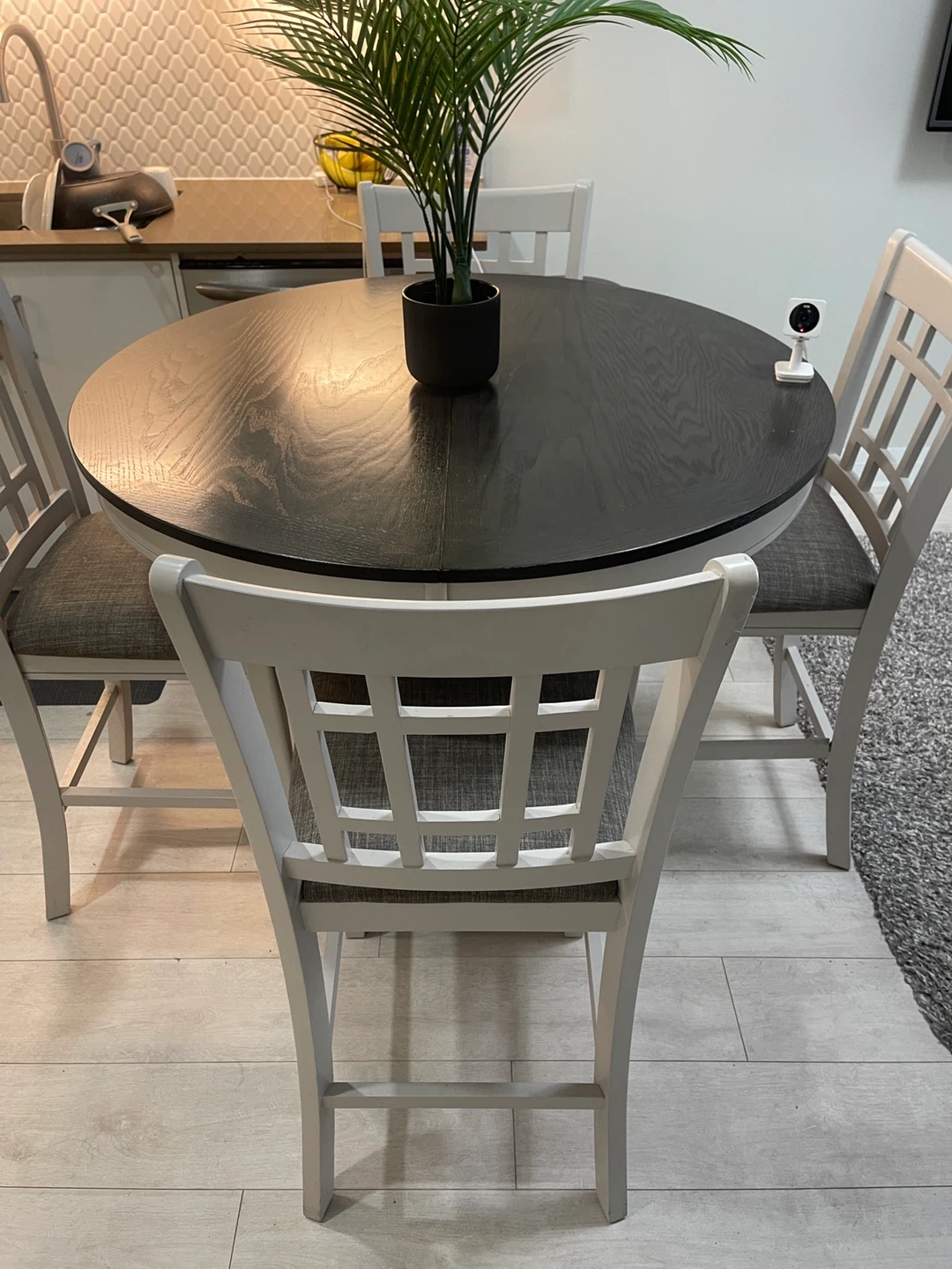 This is a round dining table with a dark wood finish top and white legs. It comes with four upholstered chairs featuring grey fabric seats and white frames. Perfect for smaller dining spaces or kitchens!