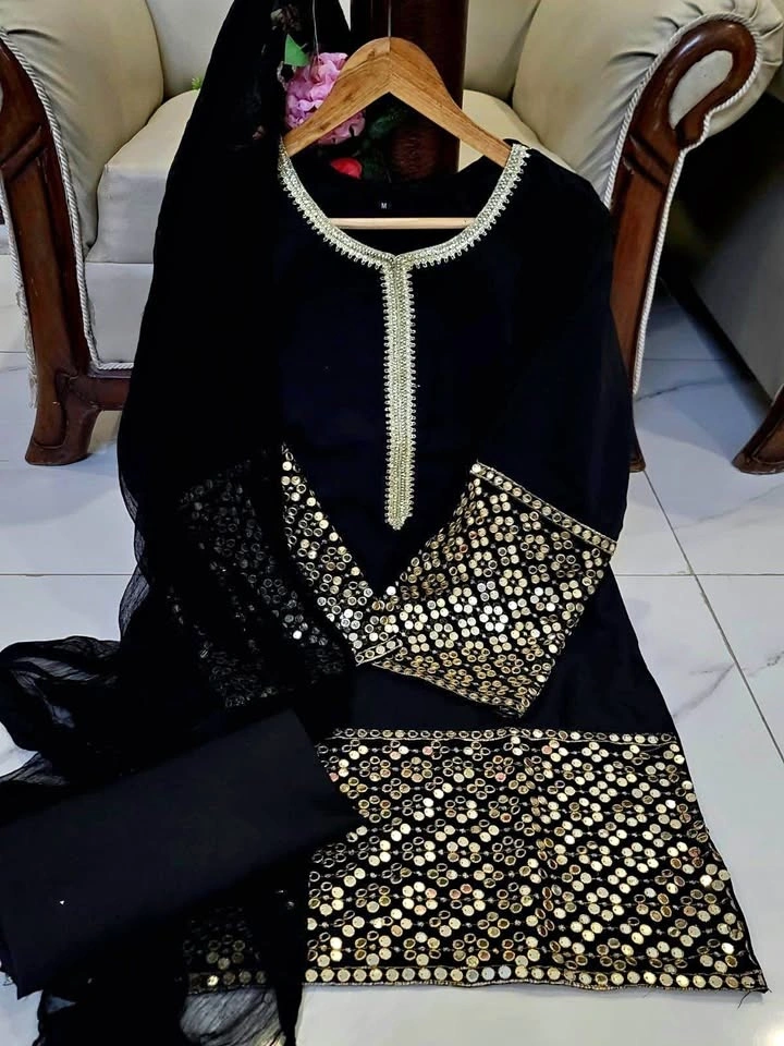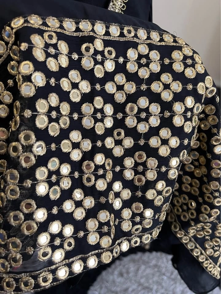Beautiful black 3 pcs Mirror Work Suit with farshi shalwar