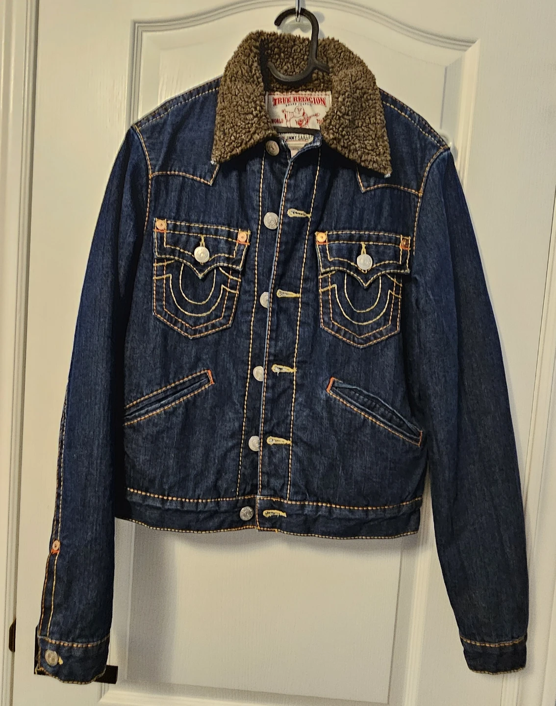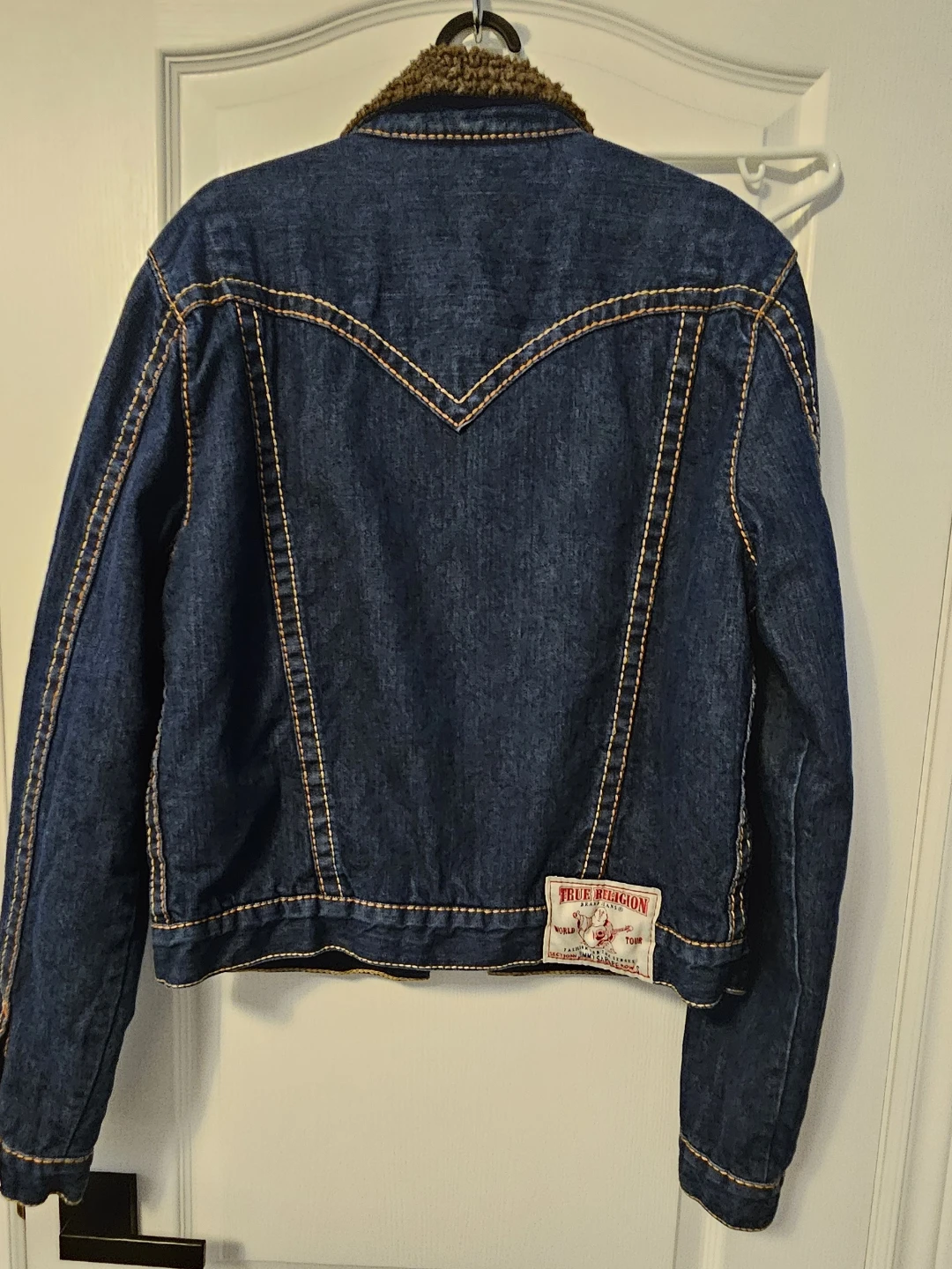 Here's a stylish True Religion denim jacket, complete with sherpa! It features the brand's signature horseshoe detailing on the pockets and a classic button-up design. Perfect for adding a bit of flair to your wardrobe.