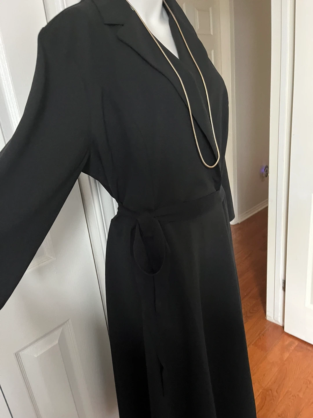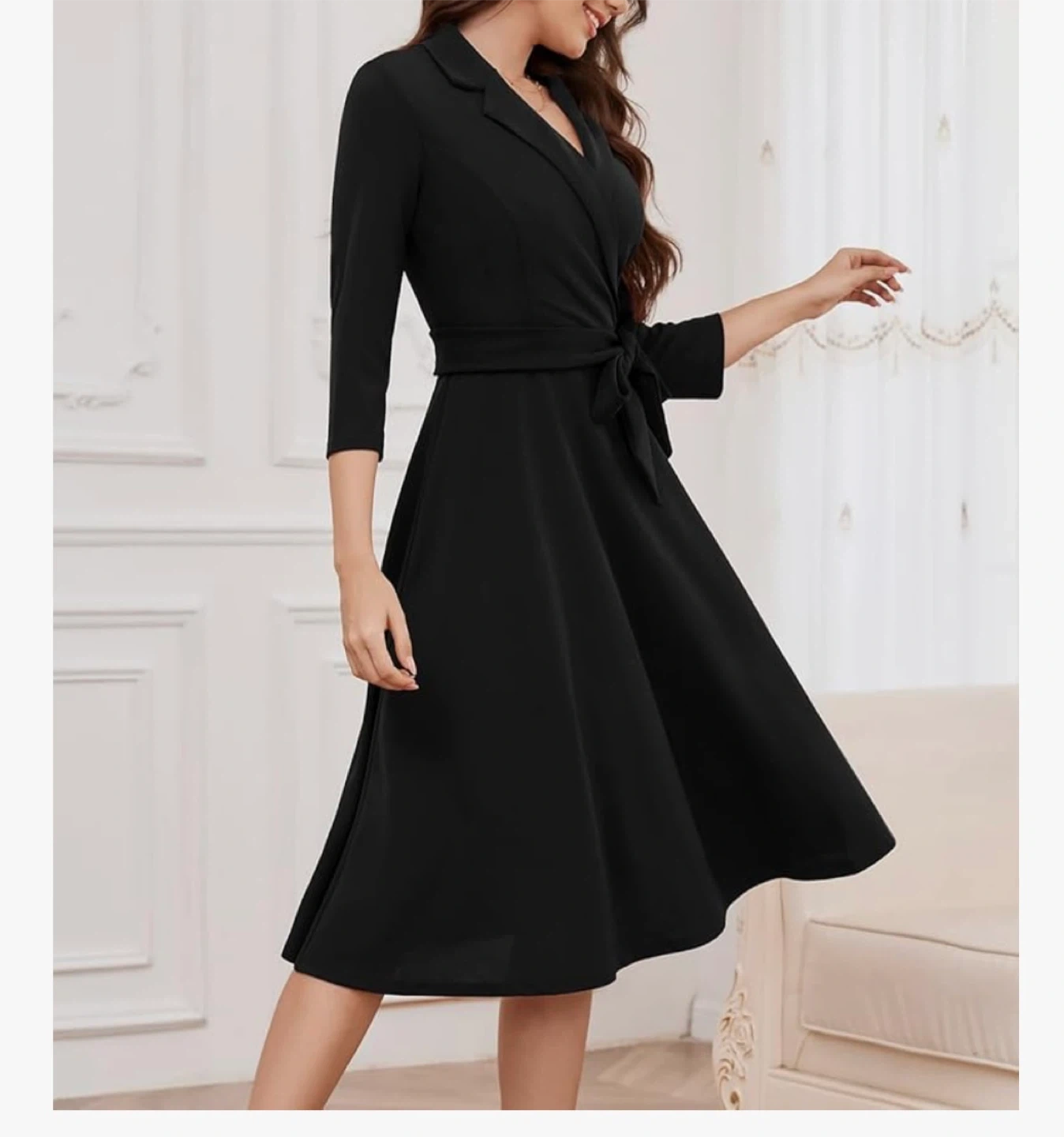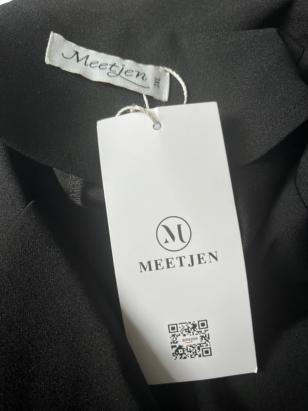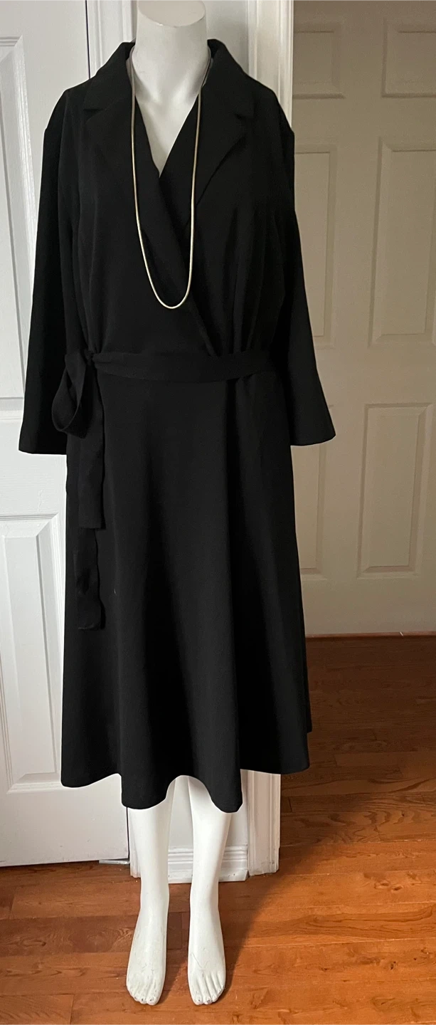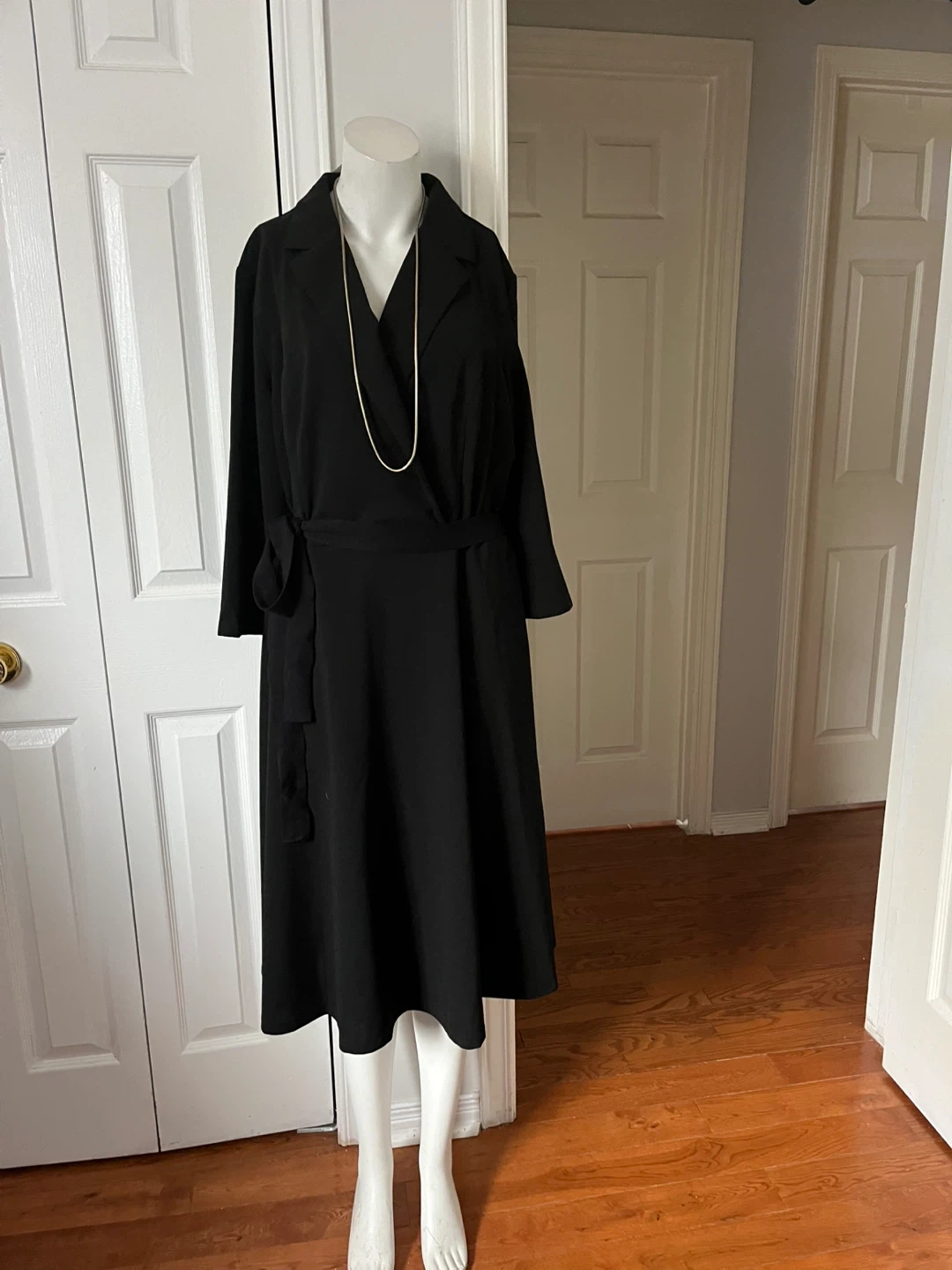 This is a MEETJEN black wrap dress. It's a size 3XL and features a tie belt. The dress has 3/4 sleeves and a V-neckline. It's a great choice for various occasions!