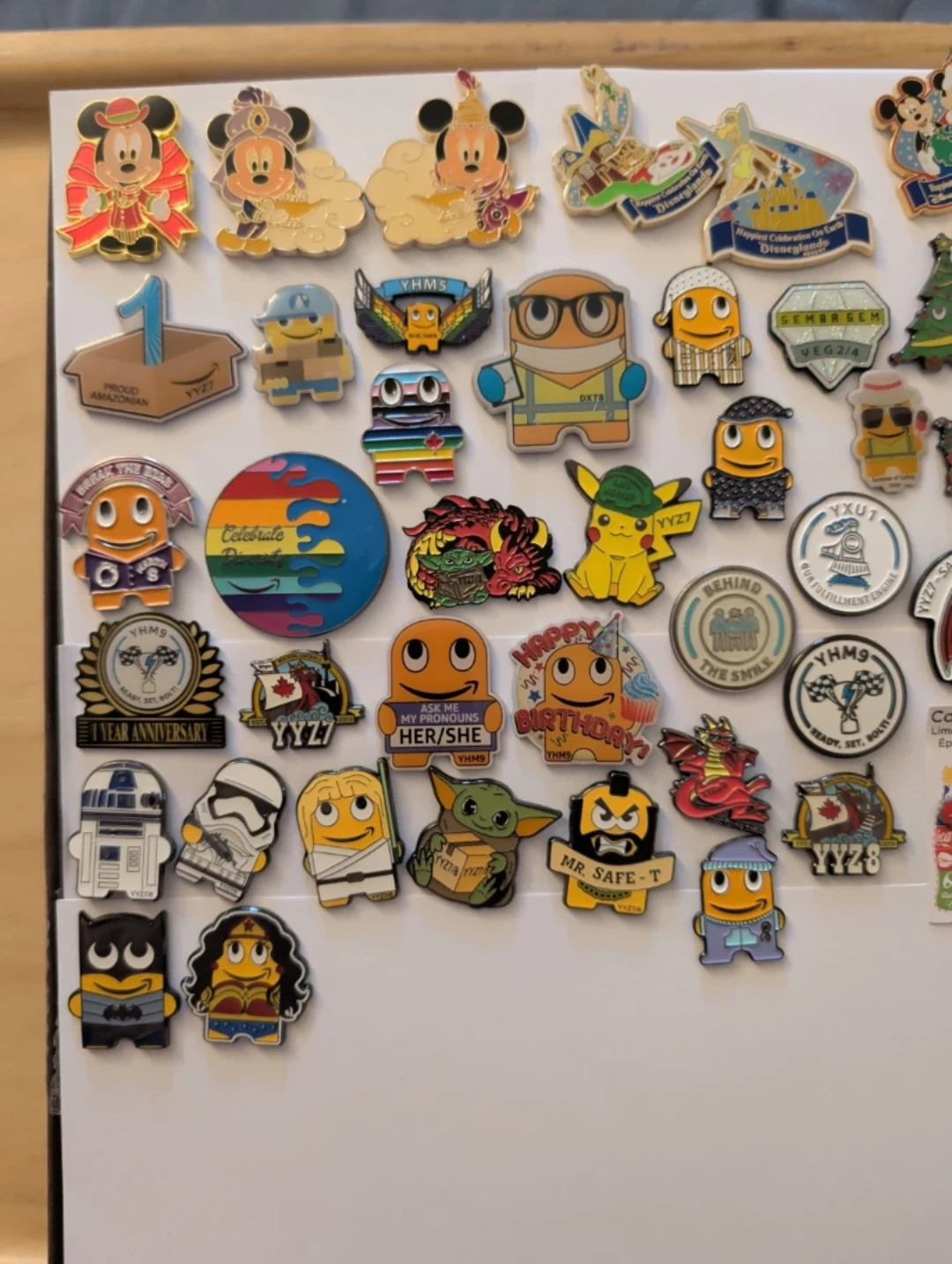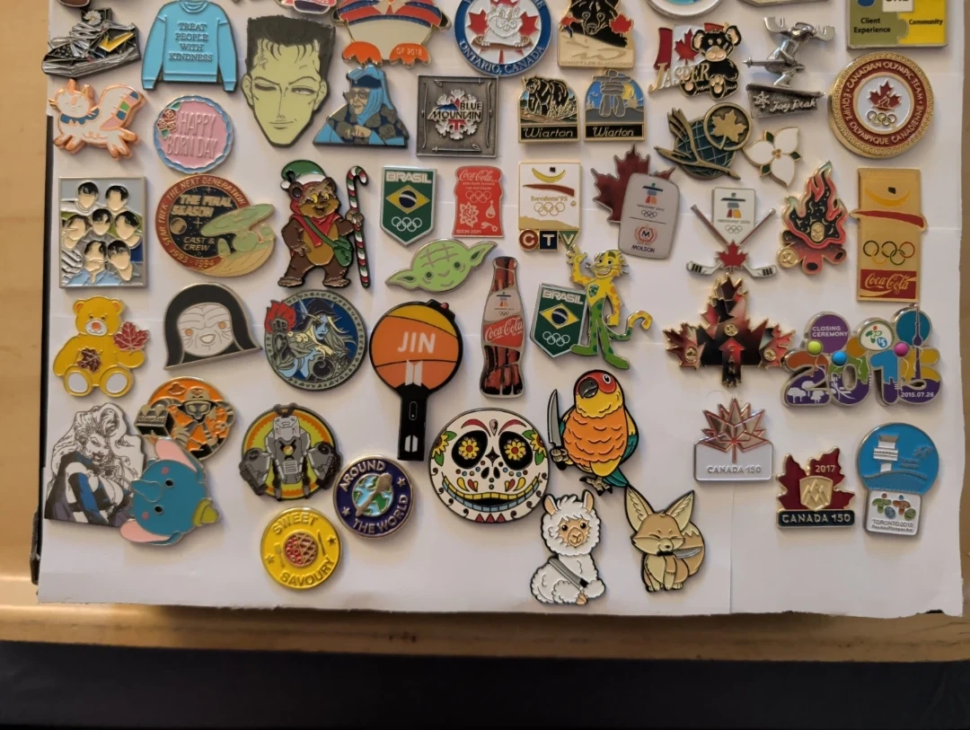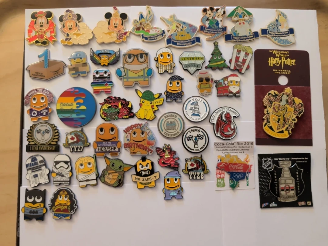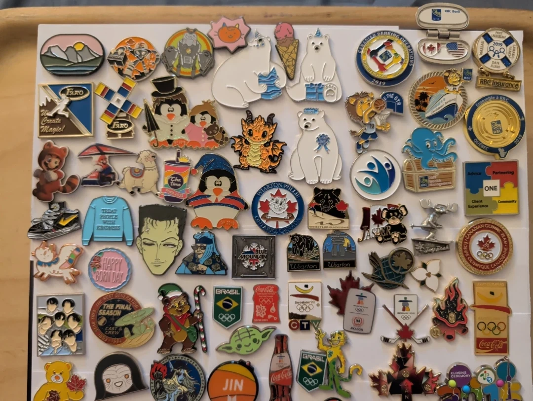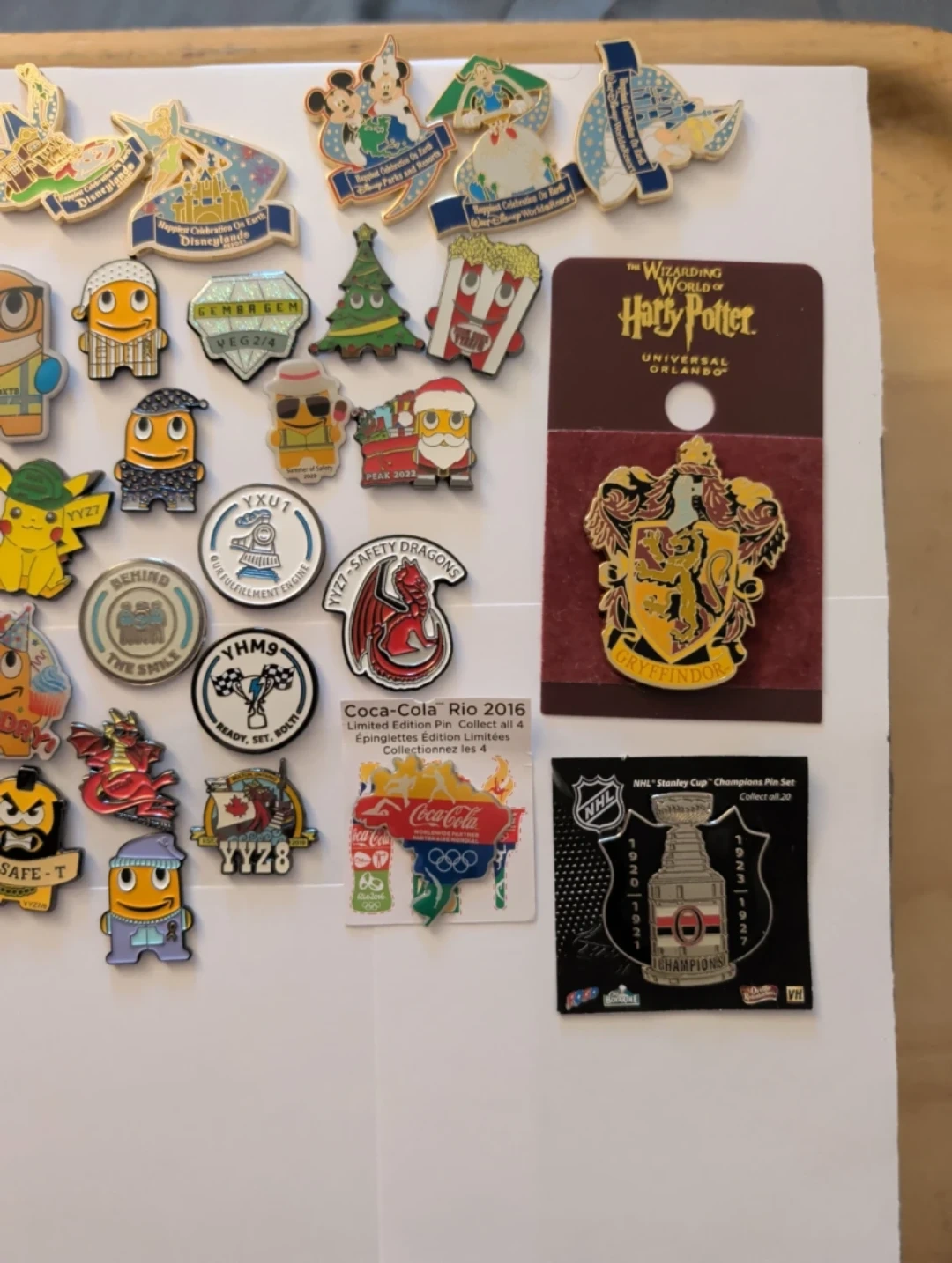 This is a large collection of various enamel pins featuring a wide range of designs and themes. It includes pins from Disney, Coca-Cola, the Olympics, Harry Potter, and many other pop culture and travel-related motifs. These pins are great for decorating jackets, bags, or pin boards!