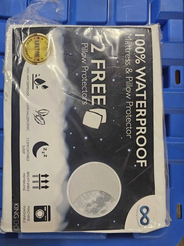 Protect your mattress with this brand new Everlasting Comfort 100% waterproof king size mattress protector, complete with two free pillow protectors. It's hypoallergenic, designed for comfortable sleep with its breathable membrane, and conveniently machine washable. Key features include: * 100% Waterproof * Hypoallergenic * Breathable Membrane * Machine Washable * Includes 2 Pillow Protectors. Rest assured, if the ad is up, it's available!