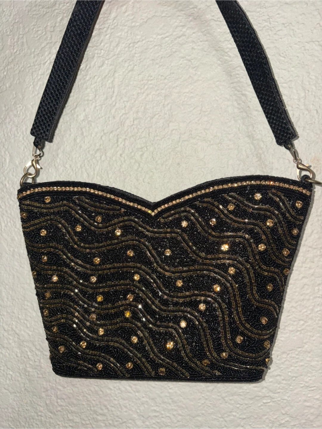 Selling a lovely black evening bag! It features intricate beadwork all hand made and a stylish design, perfect for special occasions or a night out