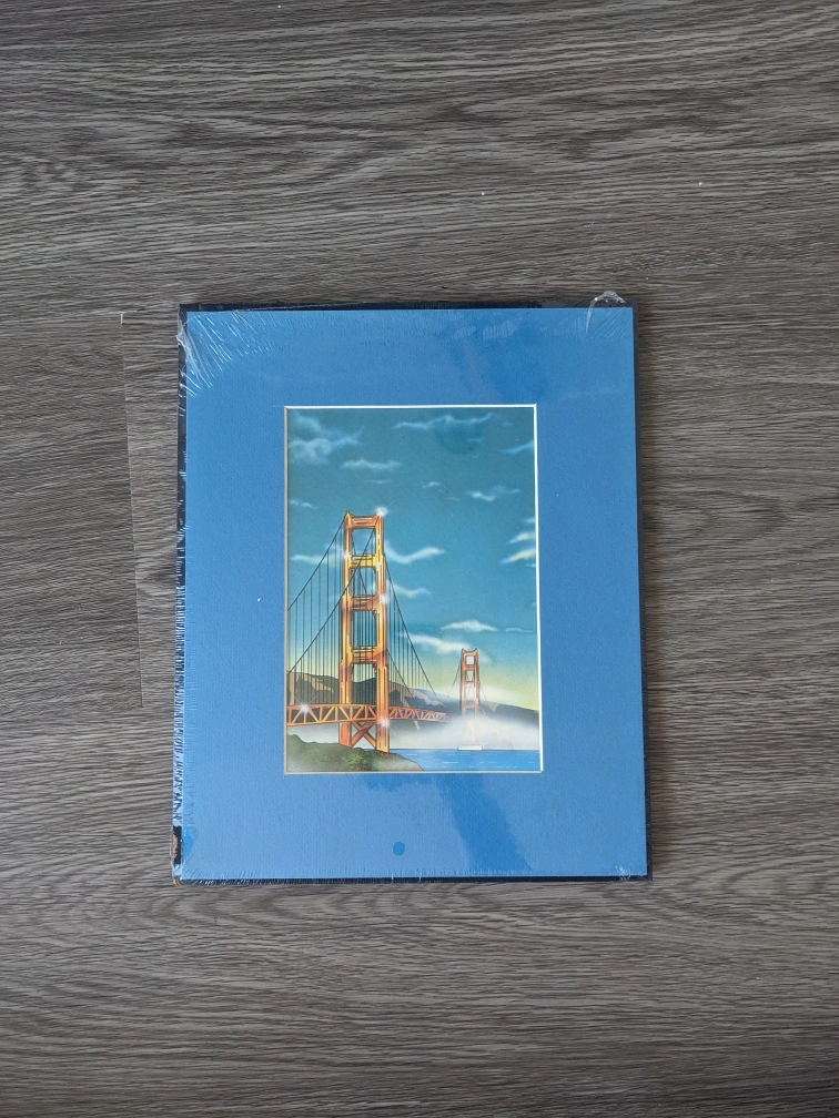 Set of 2 framed art prints, featuring a single orange tulip in a glass vase and a view of the Golden Gate Bridge. Slightly scuffed up in the corner from storage but otherwise still in the plastic wrap!!