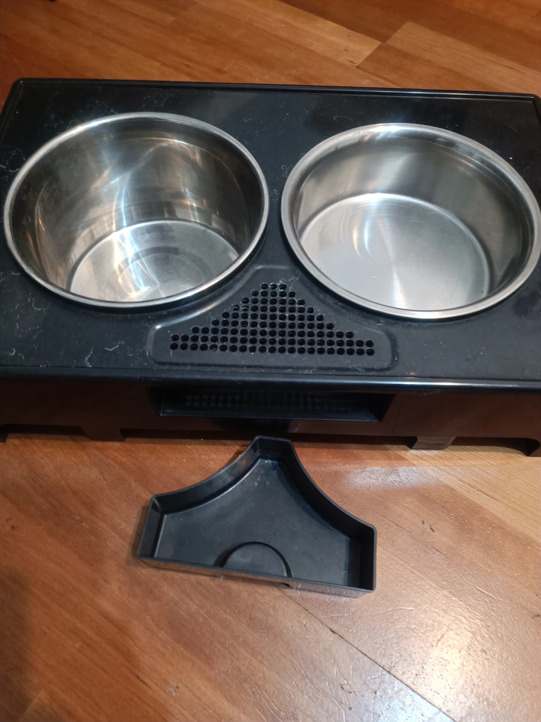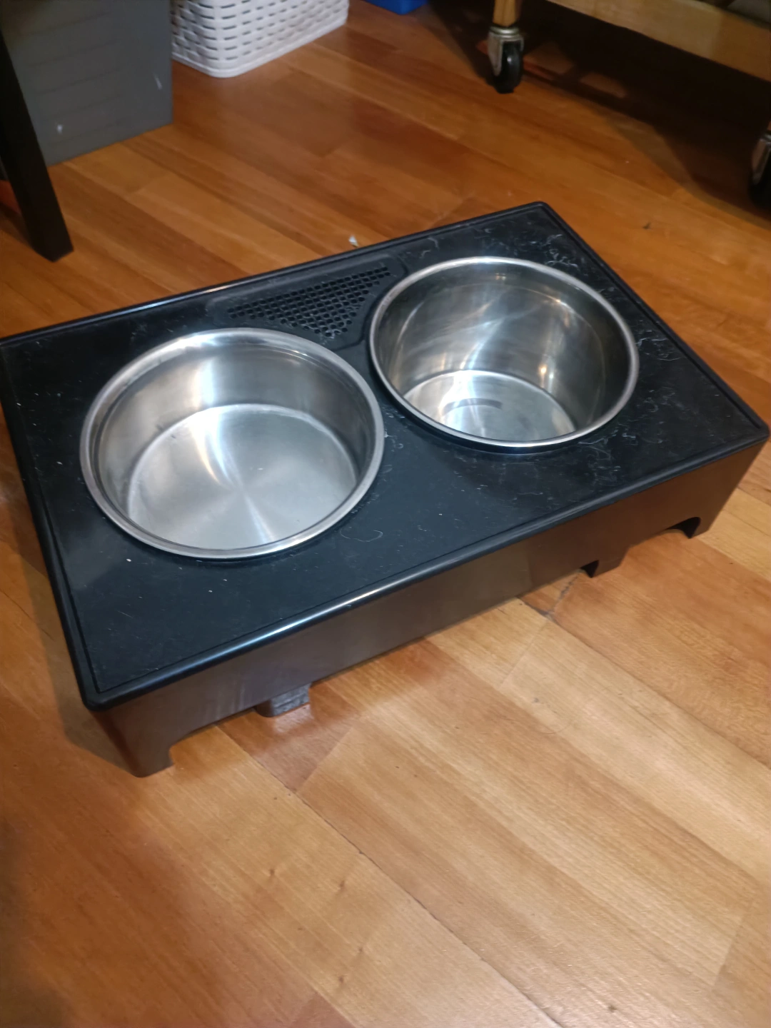Double pet bowl feeder. Elevated design. Two stainless steel bowls. Removable tray for easy cleaning. Black plastic base. Good for small to medium-sized pets.