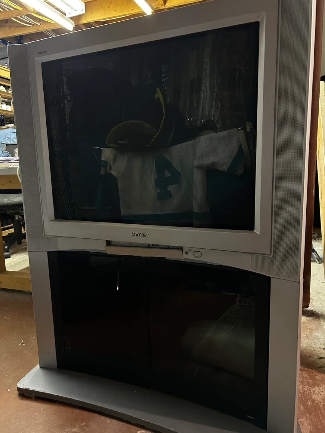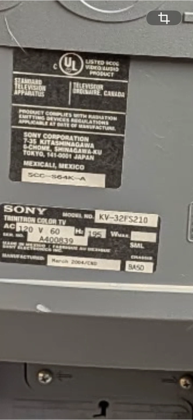 Sony Trinitron color TV model KV-32FS210. Manufactured March 2004. Includes various audio-visual inputs. Great for retro gaming or analog broadcasts!