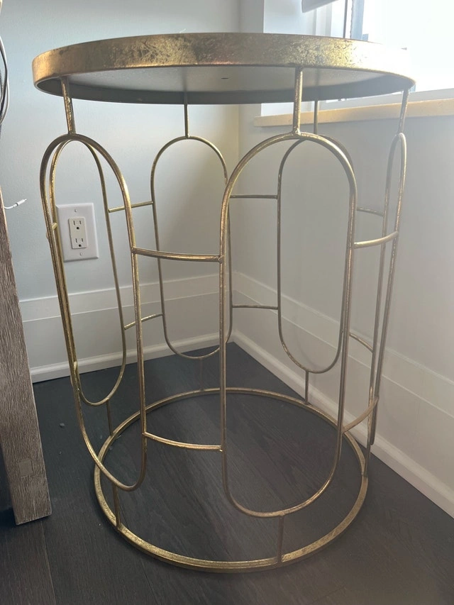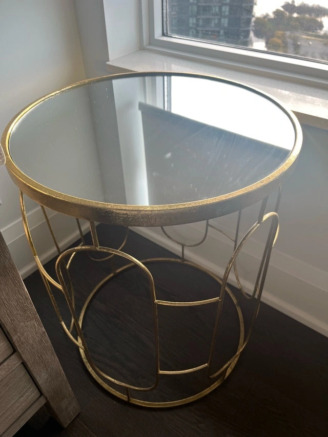 Round gold side table with a mirrored top and stylish metal frame. Dimensions: 460 (D) x 600 (H) mm or 18” (D) x 23.7” (H). It's in good condition and ready to elevate your decor!