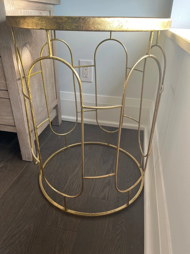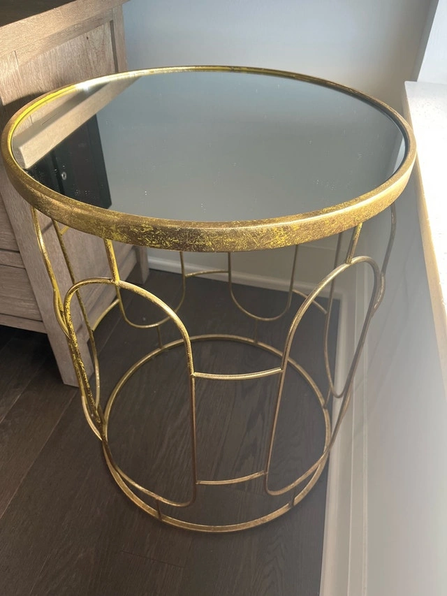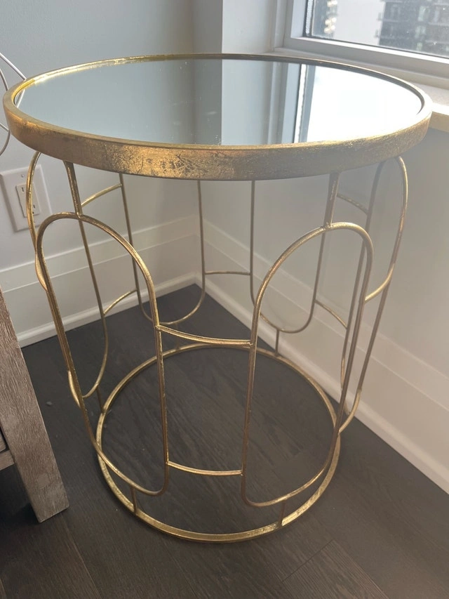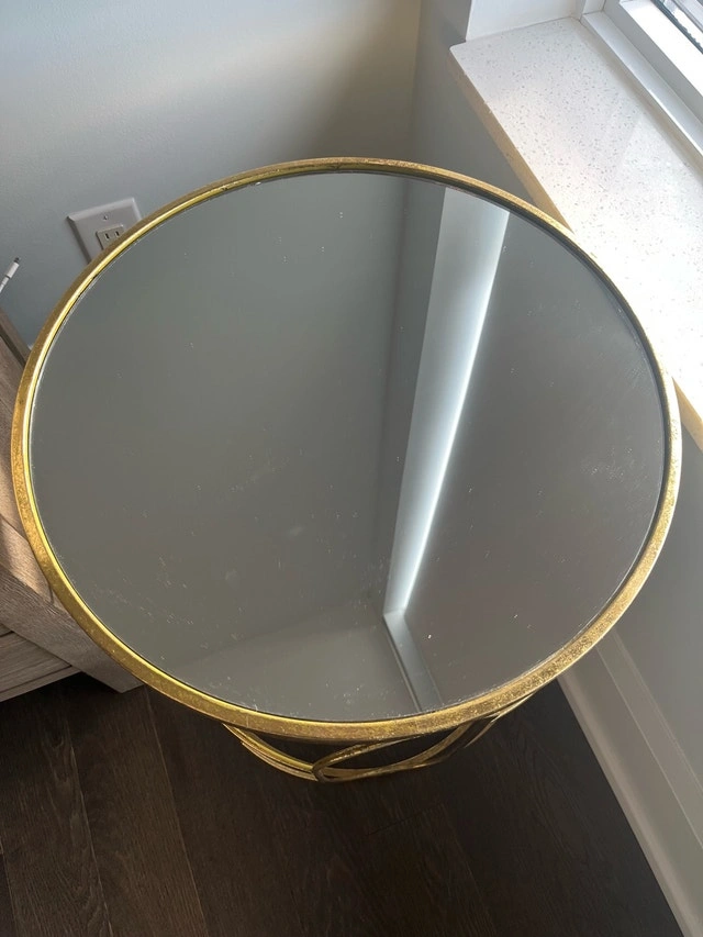 Round gold side table with a mirrored top and stylish metal frame. Dimensions: 460 (D) x 600 (H) mm or 18” (D) x 23.7” (H). It's in good condition and ready to elevate your decor!