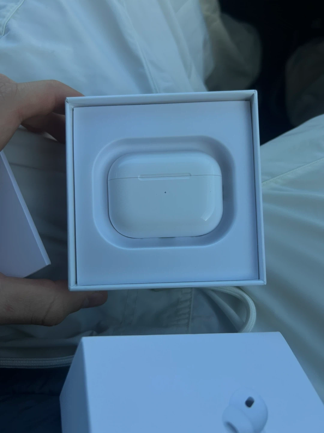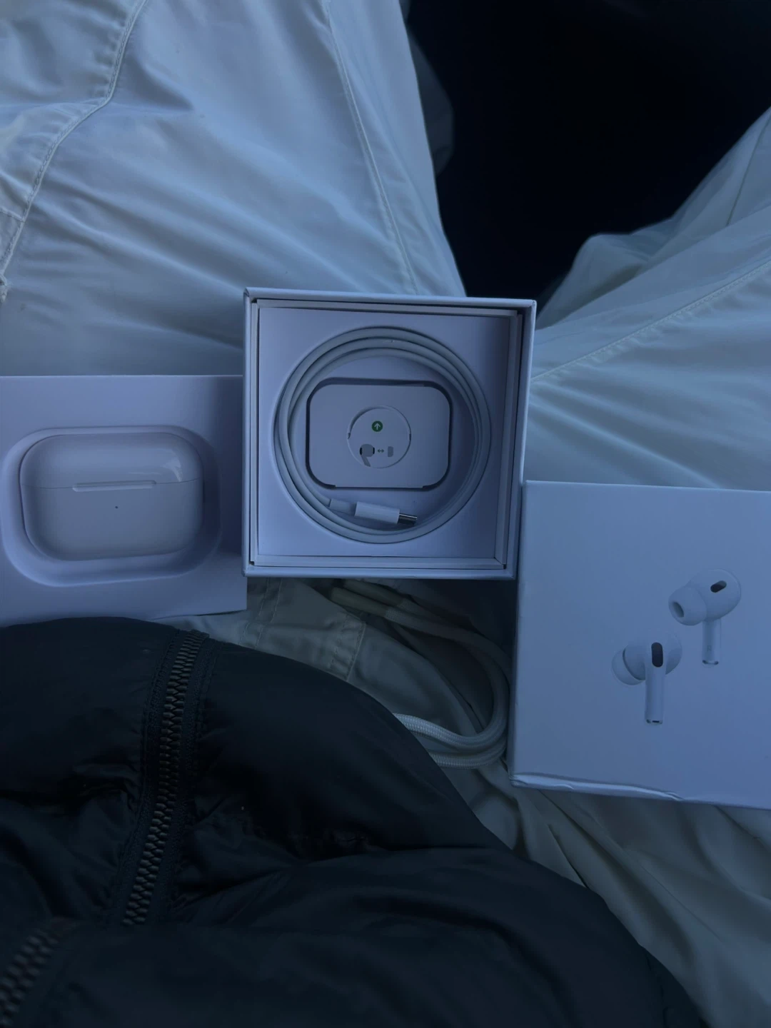 Apple AirPods Pro (2nd generation) with MagSafe Charging Case. Includes AirPods Pro, charging case, and USB-C to Lightning Cable. Designed by Apple in California.
