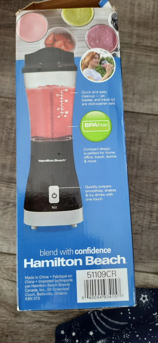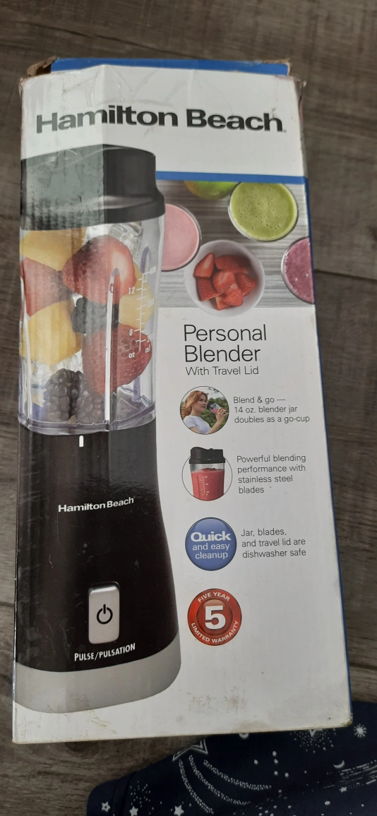 Brand new, never used. Compact design, perfect for home or travel. Quickly prepare smoothies, shakes and icy drinks. Includes travel lid. BPA free. Easy cleanup. Powerful blending performance with stainless steel blades. Five-year limited warranty.