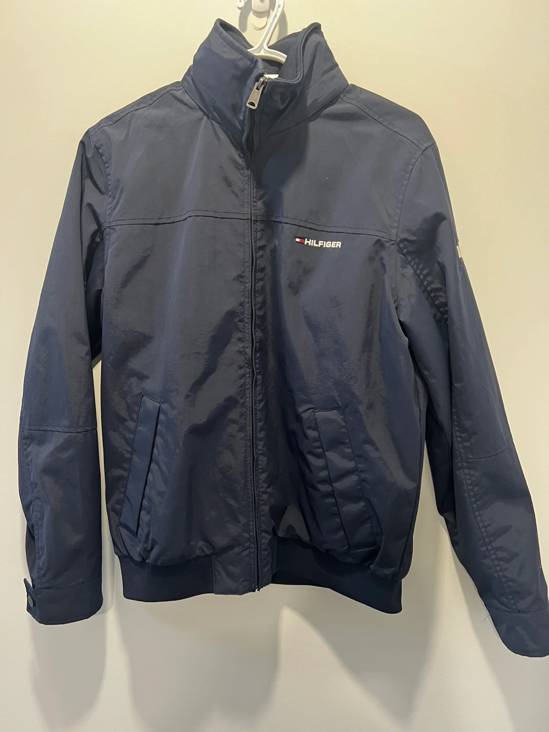 Classic navy bomber jacket from Tommy Hilfiger. It's a size S/P. Great for layering on cooler days!