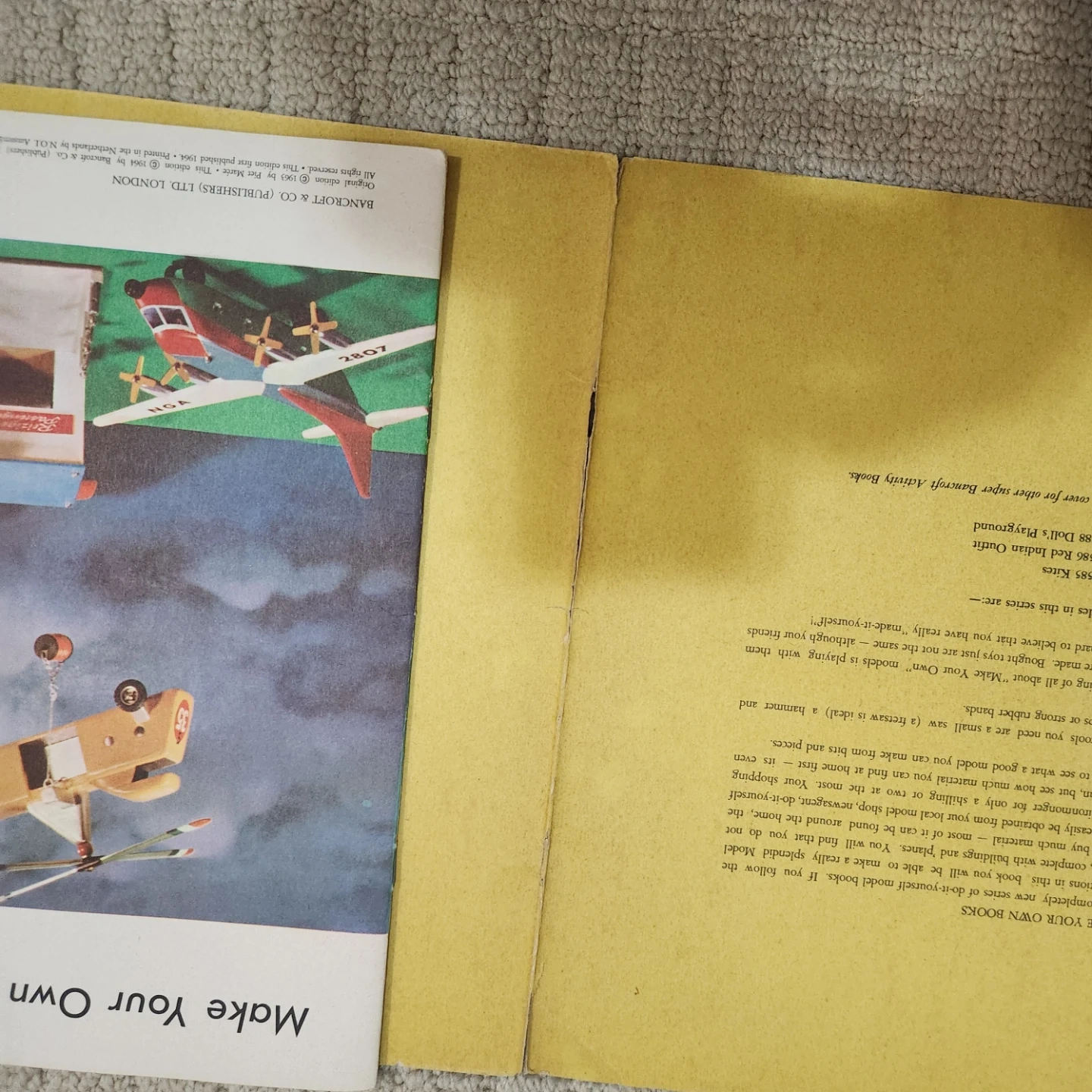 This book, copyrighted in 1963, provides instructions for building your own model airport. It includes plans for aircraft and buildings. A fun project for model enthusiasts! Cover is seperated.