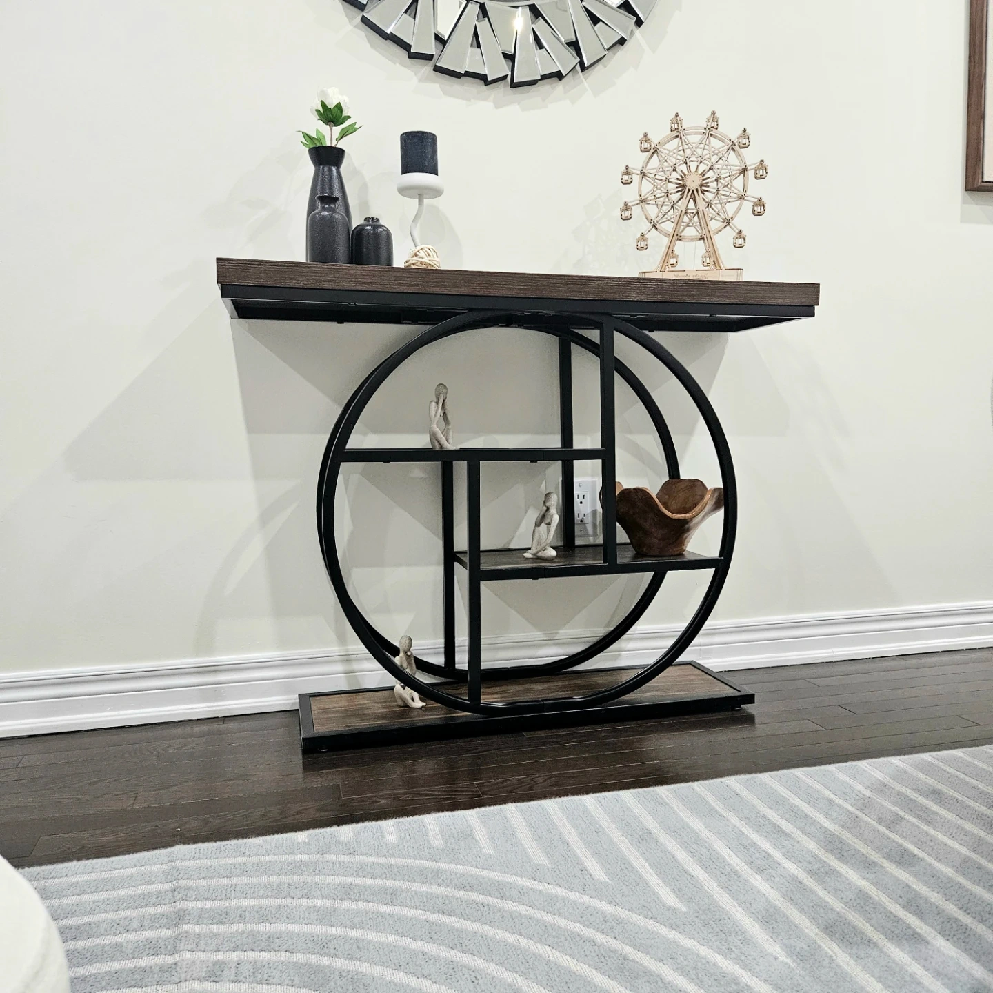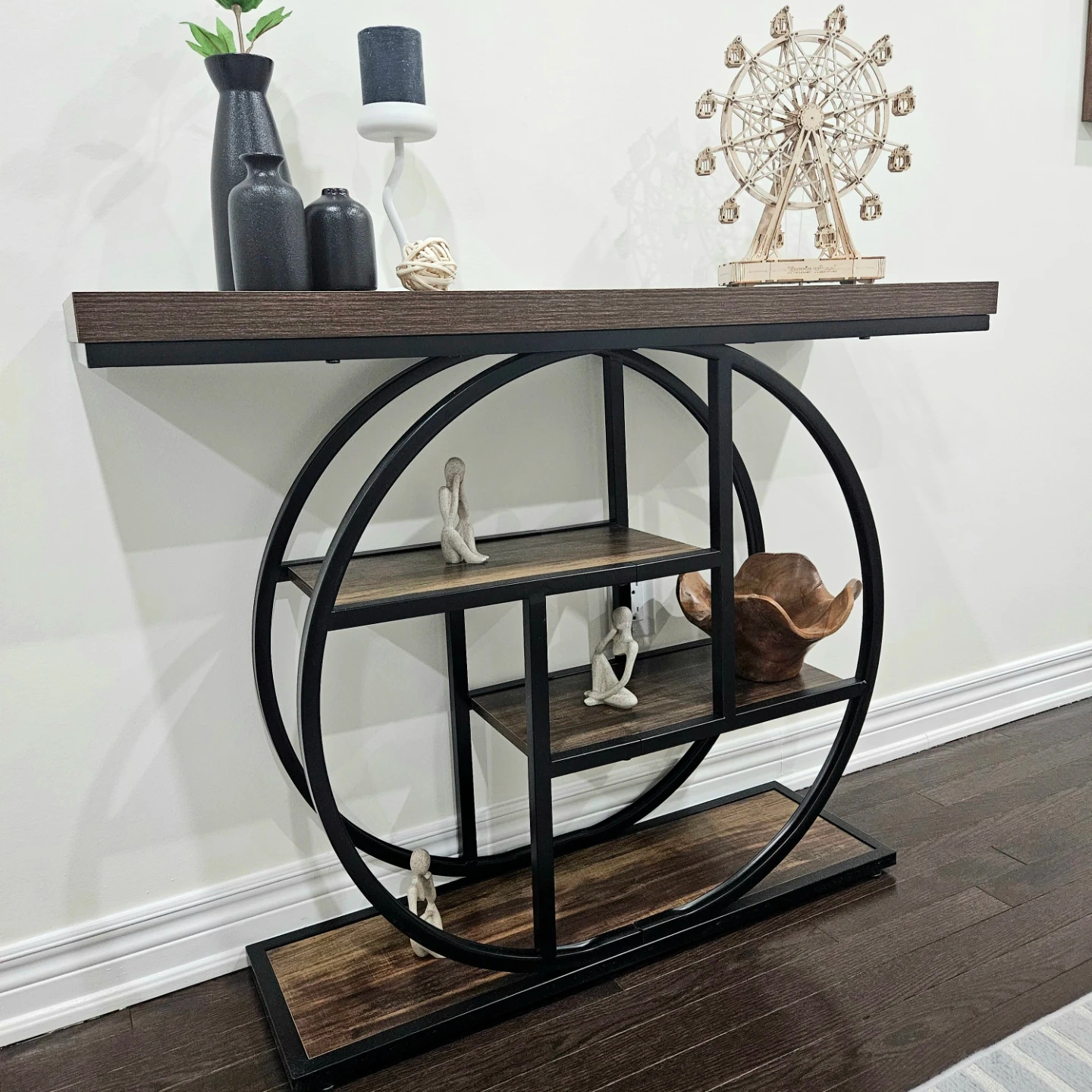 This console table features a dark wood-look top and shelving with a black metal frame. It has a unique circular and geometric design. The table has multiple shelves for storage or display.