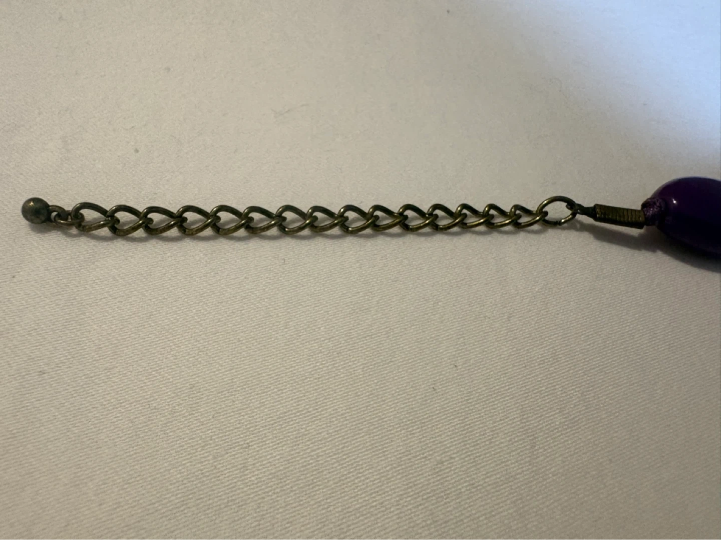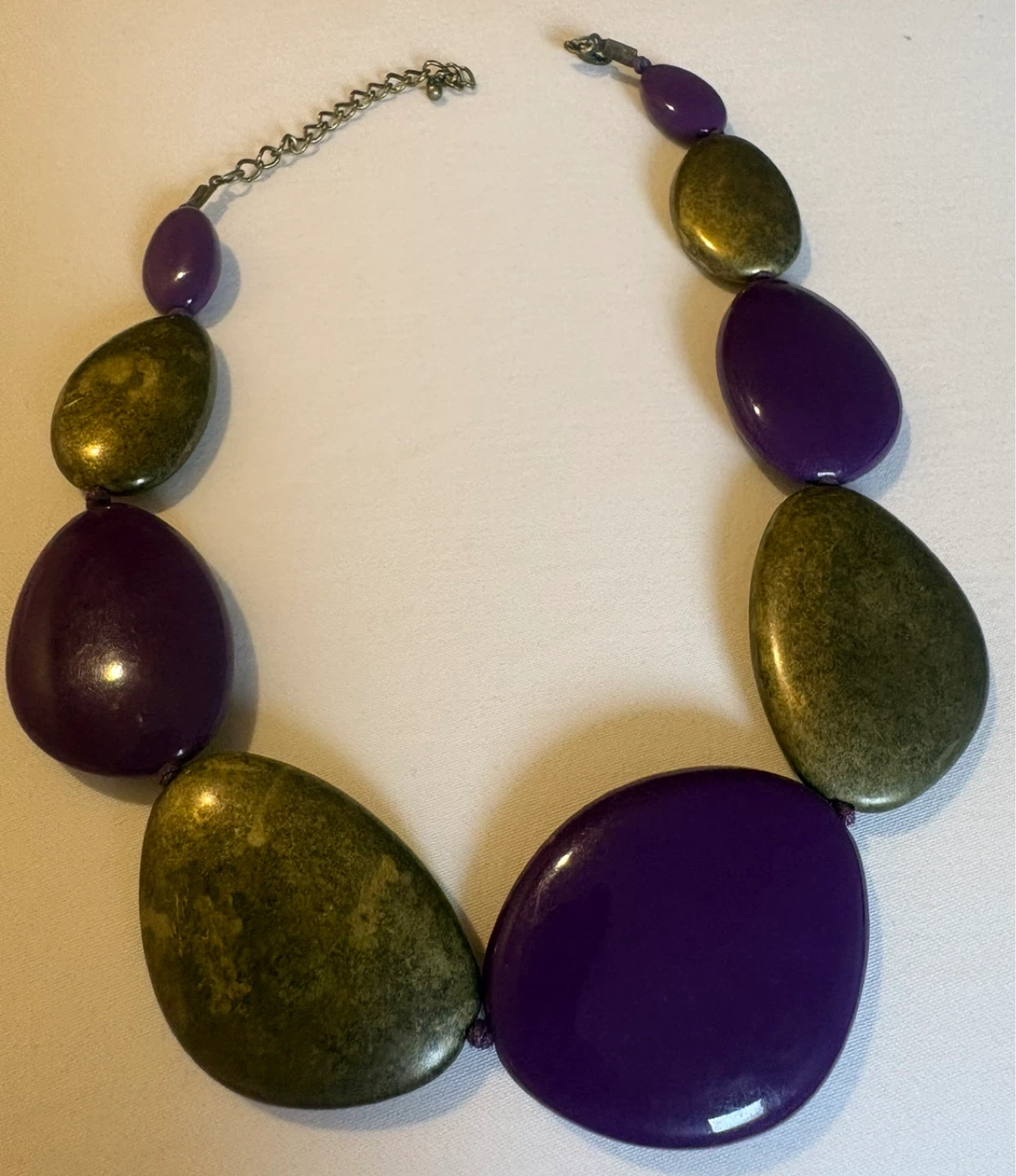 Vintage chunky statement necklace with alternating purple and goldtone teardrop-shaped beads. Features a material chain and metal clasp closure.