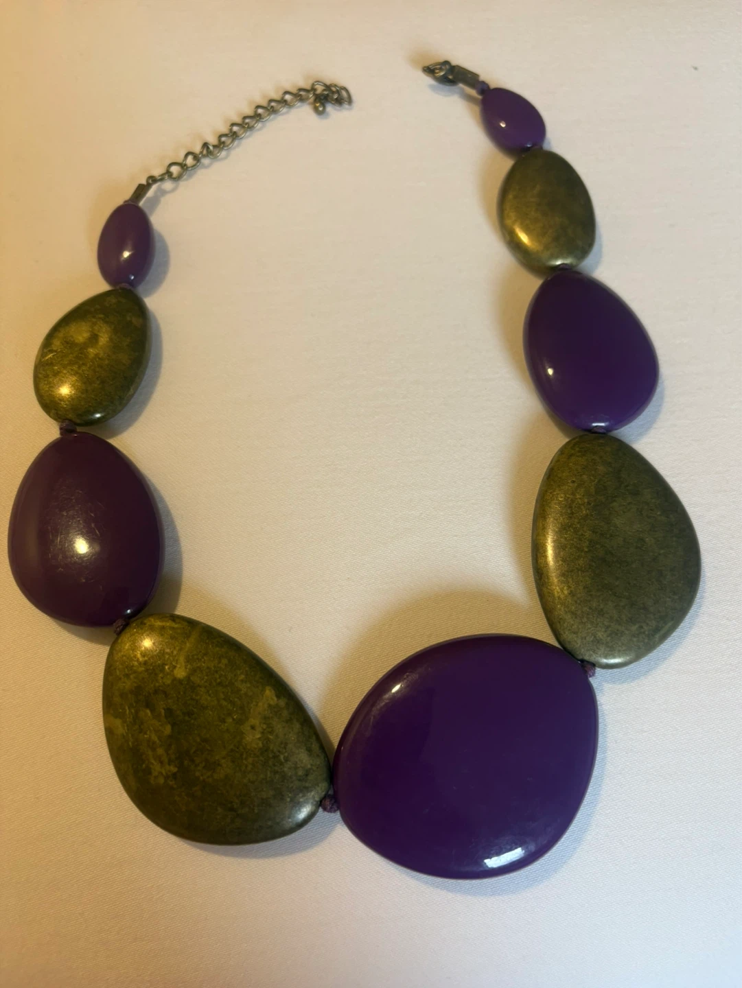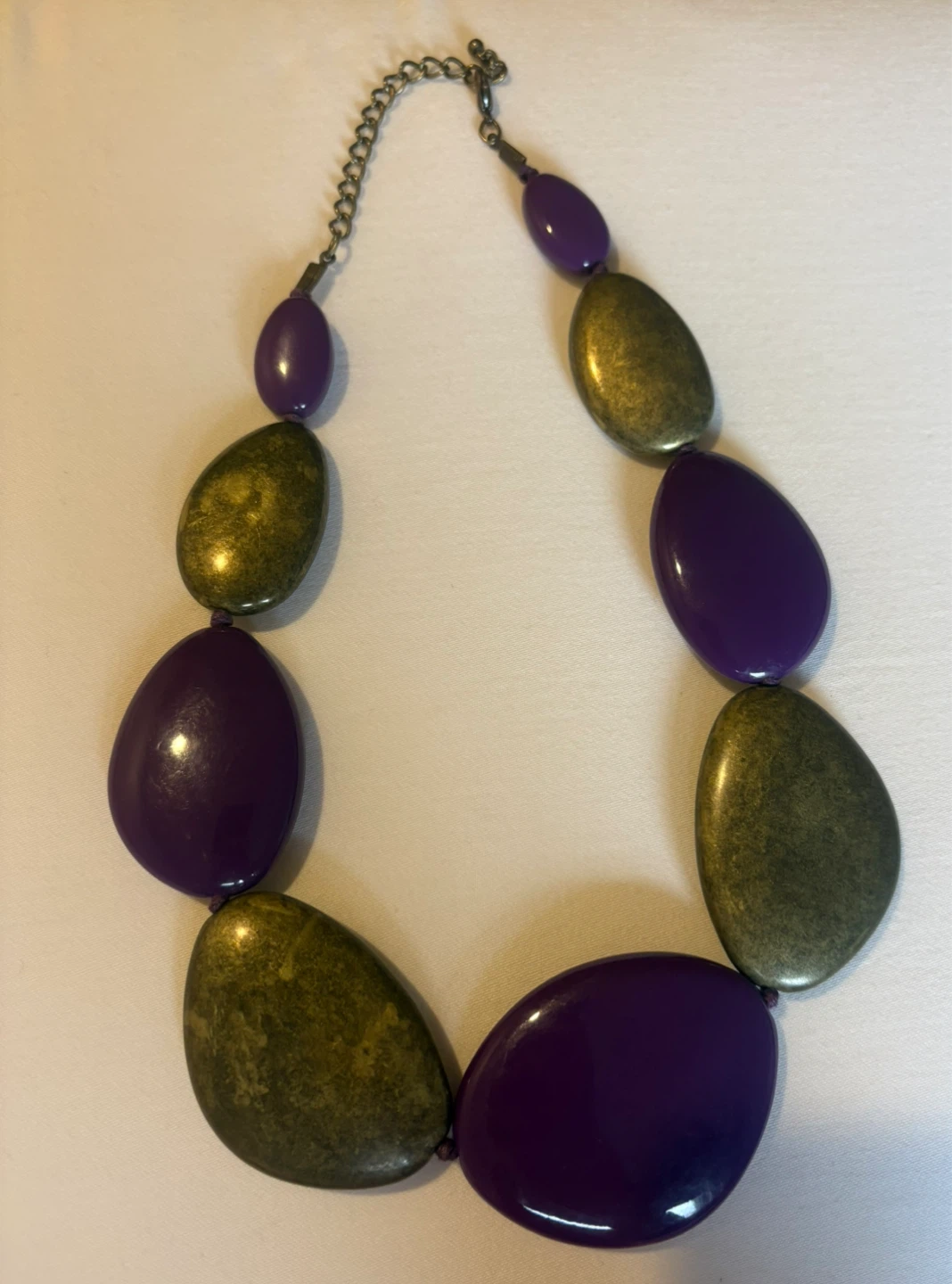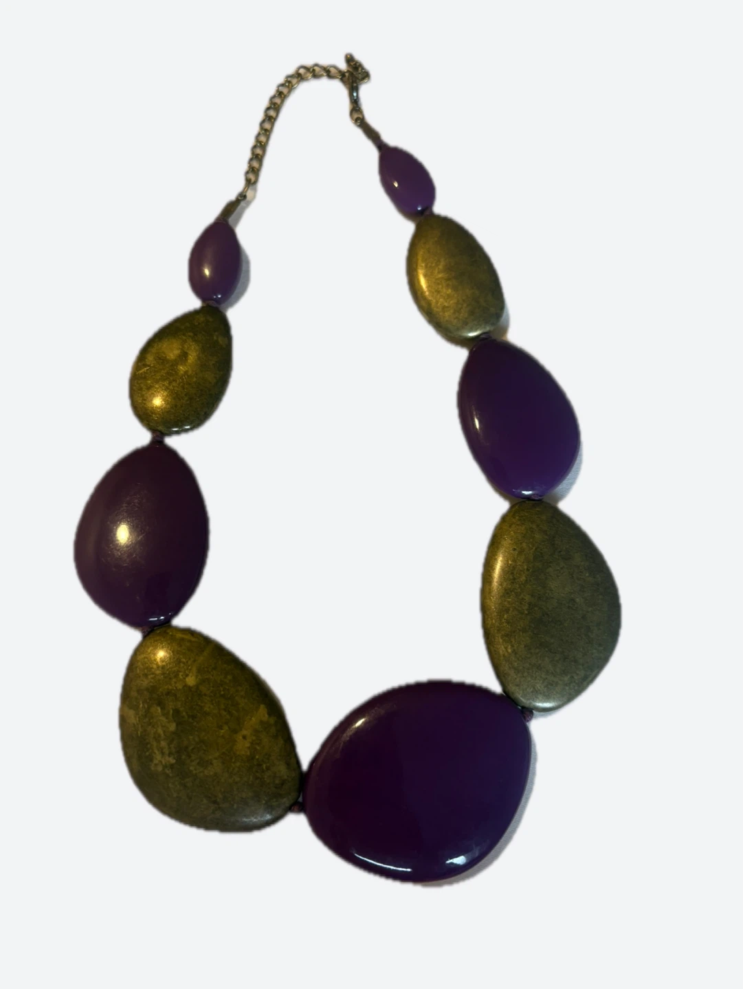 Vintage chunky statement necklace with alternating purple and goldtone teardrop-shaped beads. Features a material chain and metal clasp closure.