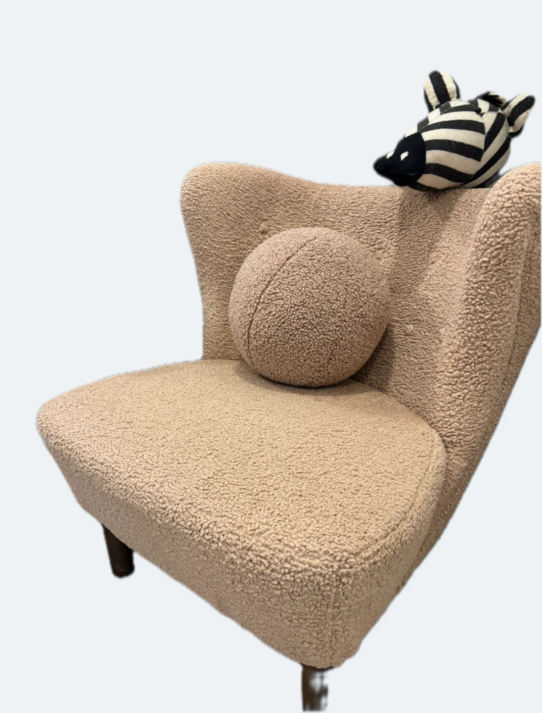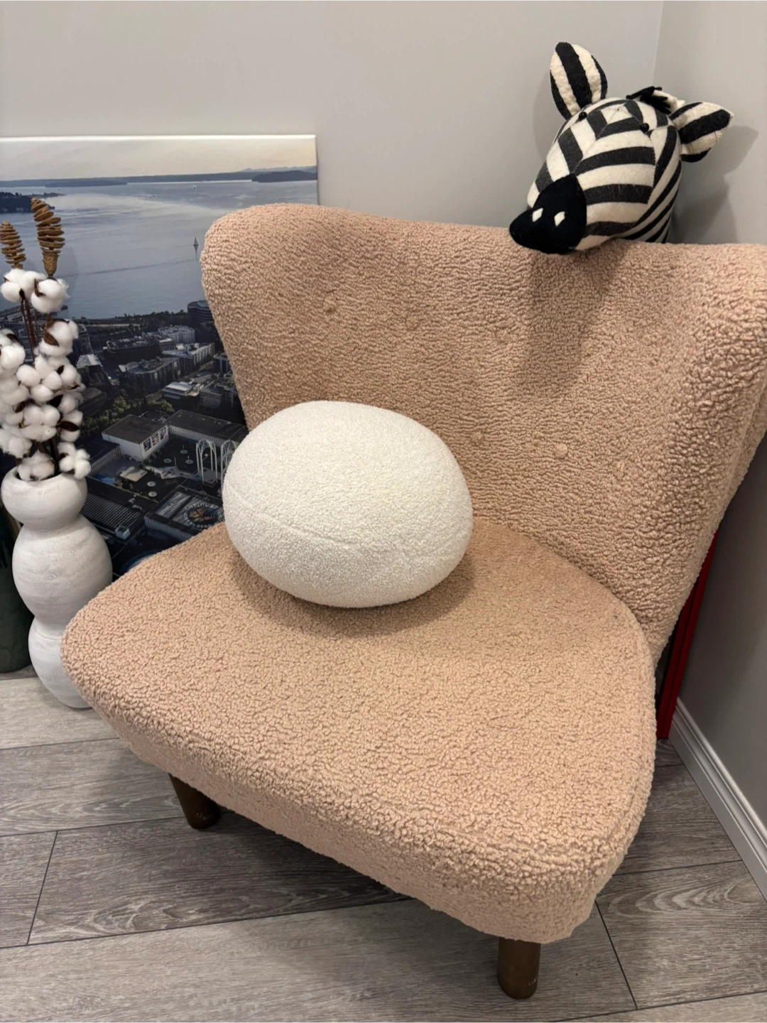 This cute accent chair is upholstered in a soft, cosy sherpa fabric. It's a light beige colour and comes with a matching round throw pillow. The chair has a unique wingback silhouette and button tufting on the backrest. This chair would make a lovely addition to a bedroom or living space!