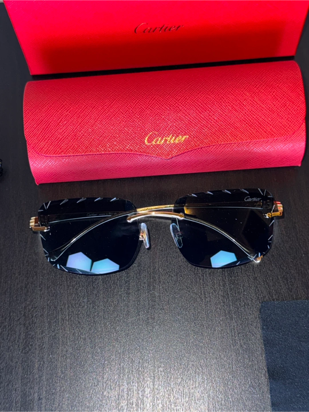 These are Cartier rimless sunglasses with black lenses. They come with the original red Cartier case, box, dust bag, and authenticity card. Gold-tone accents and detailing on the frame.