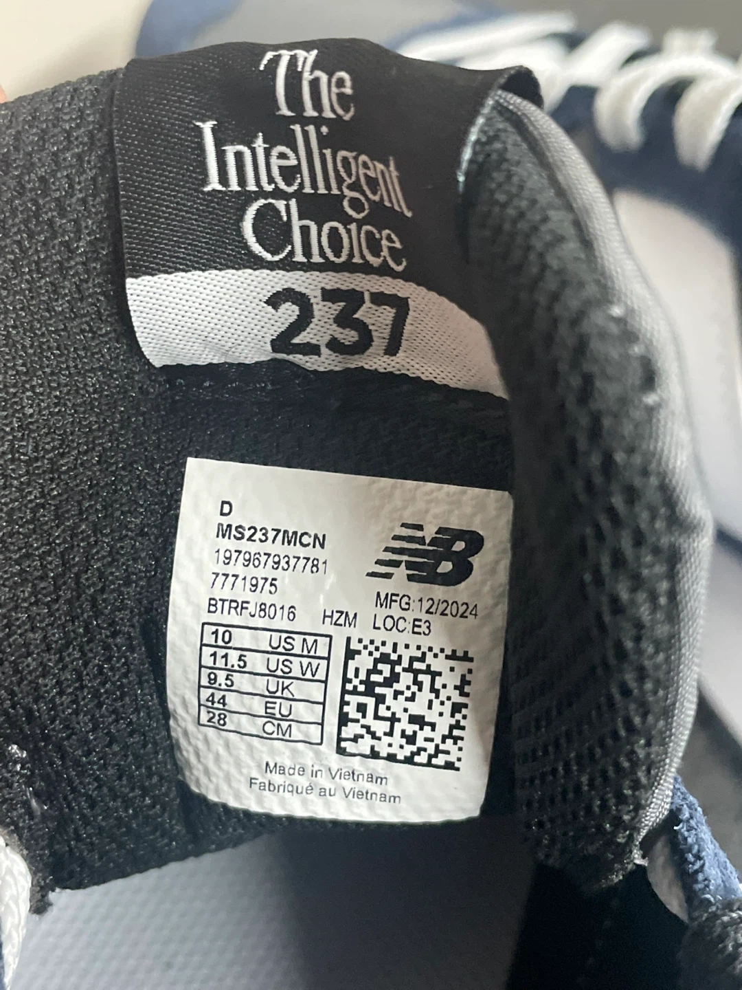 New Balance 237 sneakers in a blue and grey colourway. Men's US size 10 (UK 9.5, EU 44). These shoes feature a suede and mesh construction with a classic rubber outsole.