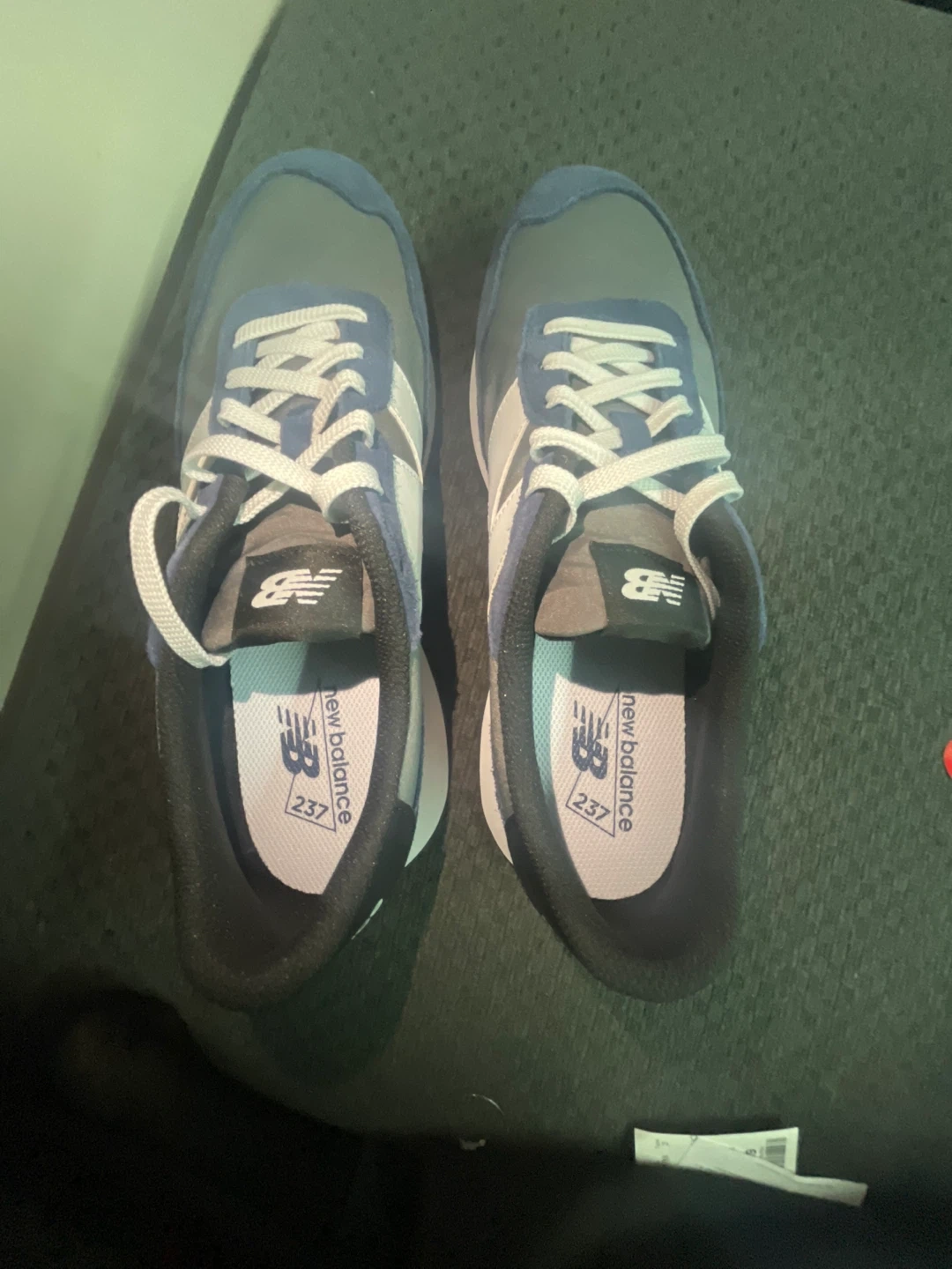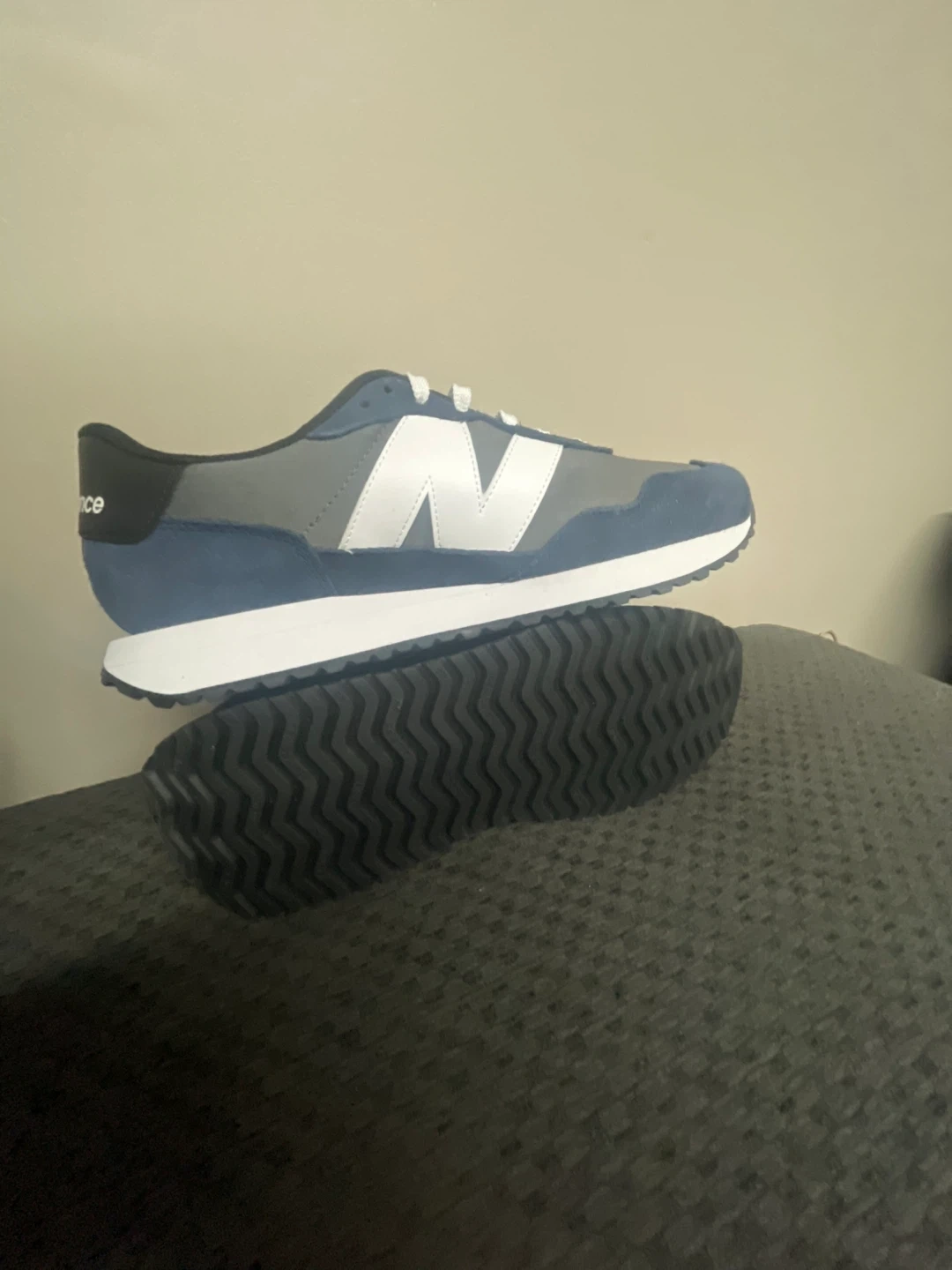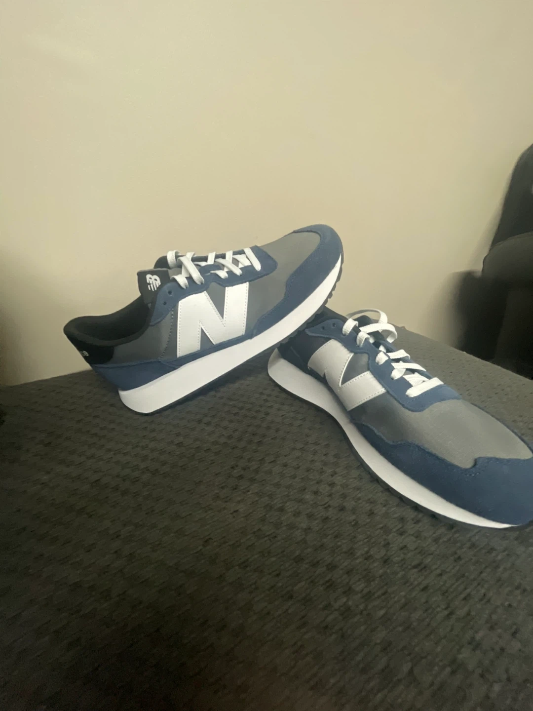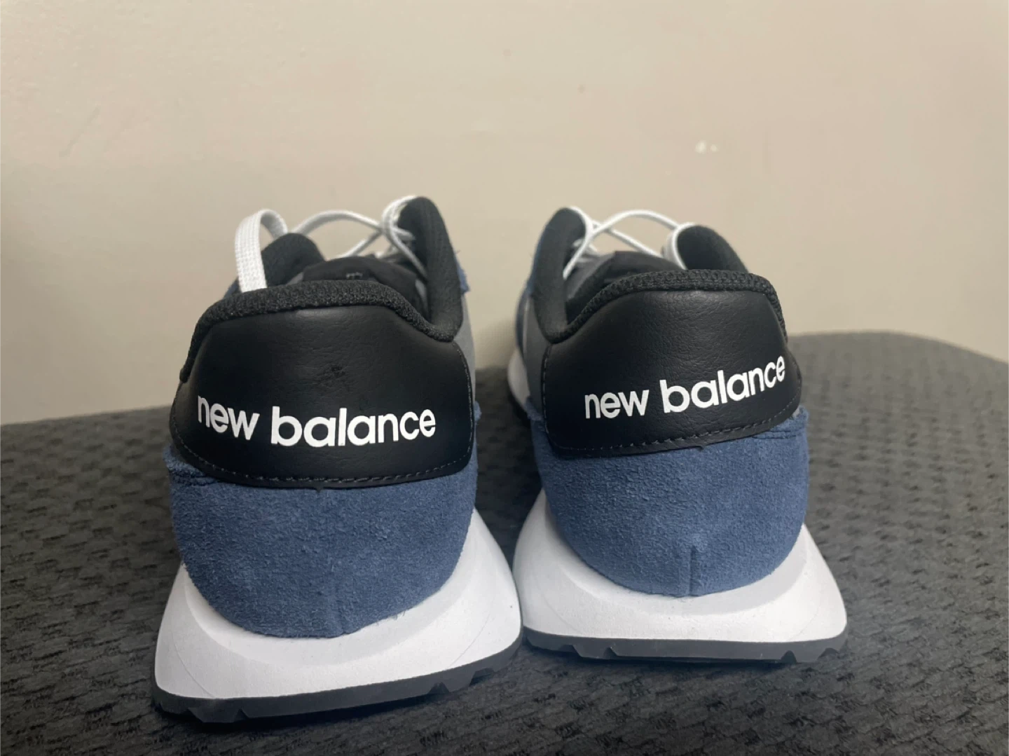 New Balance 237 sneakers in a blue and grey colourway. Men's US size 10 (UK 9.5, EU 44). These shoes feature a suede and mesh construction with a classic rubber outsole.