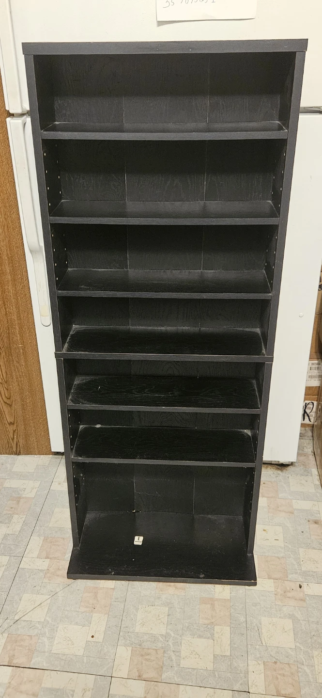 This is a black 8-shelf media bookcase It's a simple and functional storage solution. Perfect for dvds cds, decor, or media. It has adjustable shelves for versatile storage options! This item has a little dust on it. Yes, but I'm quite ill and I can't clean it well right at the moment. It is practically like new, almost no scratches on the outside with nice looking fake wood design on the exterior and the interior walls. So it looks pretty decent when you look at it from above and the sides when you're walking by it it's a nice looking unit