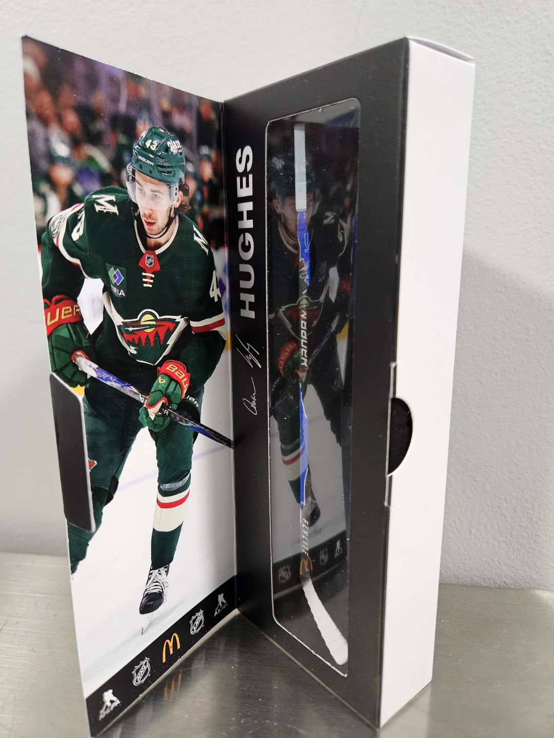 This collectible features a mini hockey stick of player Quinn Hughes, presented in a box with a card. It's part of a McDonald's promotion.
