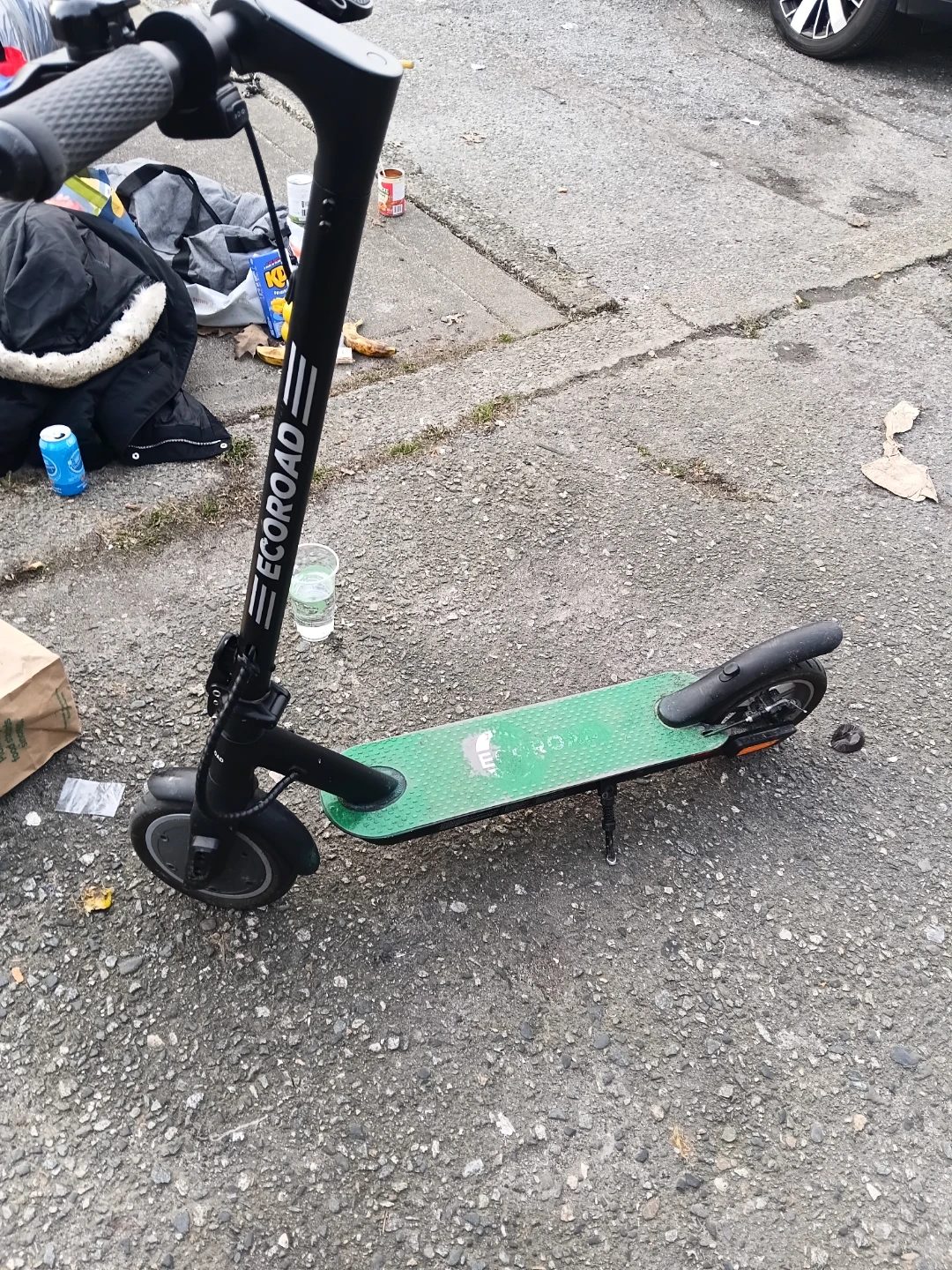 This is an Ecoroad electric scooter with a green deck. It's a fun way to get around town. It's suitable for commuting or recreational use.