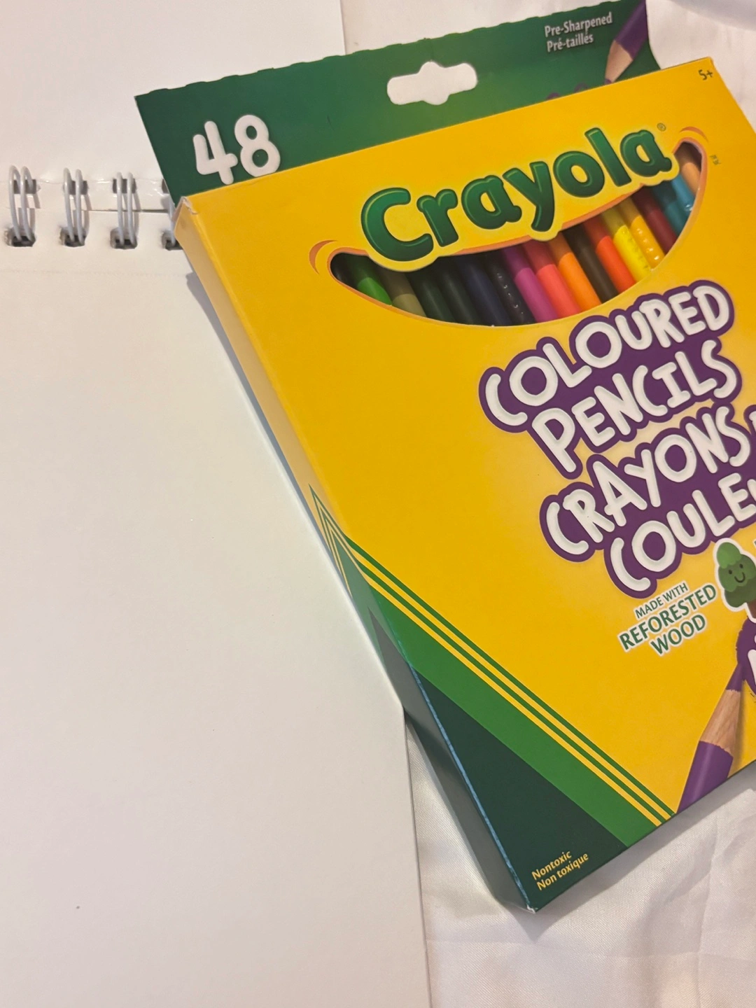 48 pack Crayola coloured pencils. Pre-sharpened. Made with reforested wood. Non-toxic.